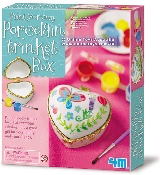 Contents: 1 Porcelain Trinket Box, Paint Brush Paint Strip (4 pot colours) and Instructions.