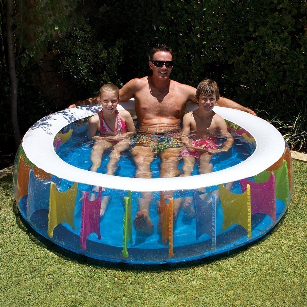 Inflatable heavy duty vinyl kids pool. Features a transparent panel design and circle/round shape. Suitable for children 3 years of age and over.