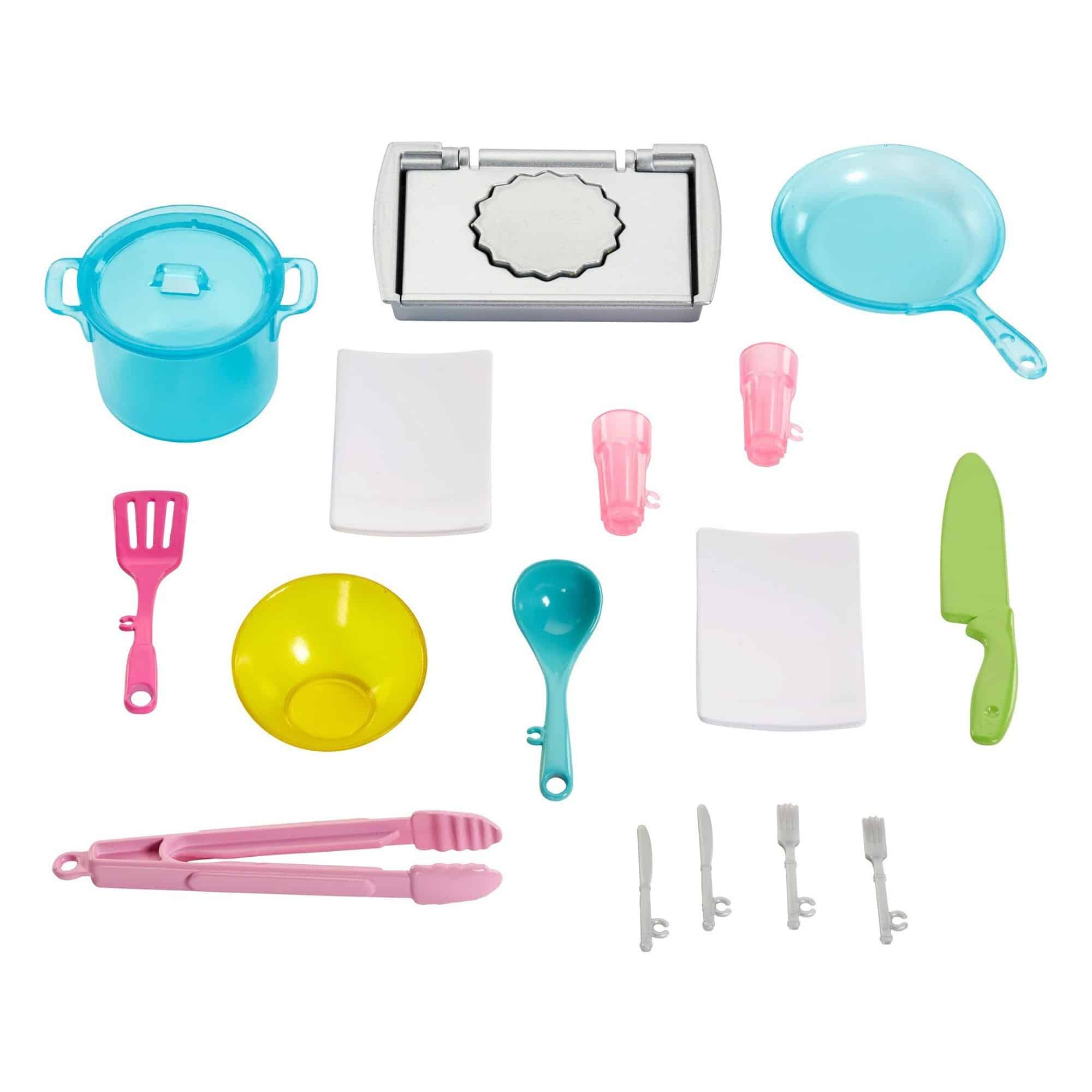 Contents: Kitchen play set with lights & sounds, 20+ accessory pieces, Veggie mold, Sandwich maker, Fry press, Oven & stove, Cookware & utensils, 5 dough colors, Barbie® doll wearing fashions & accessories.