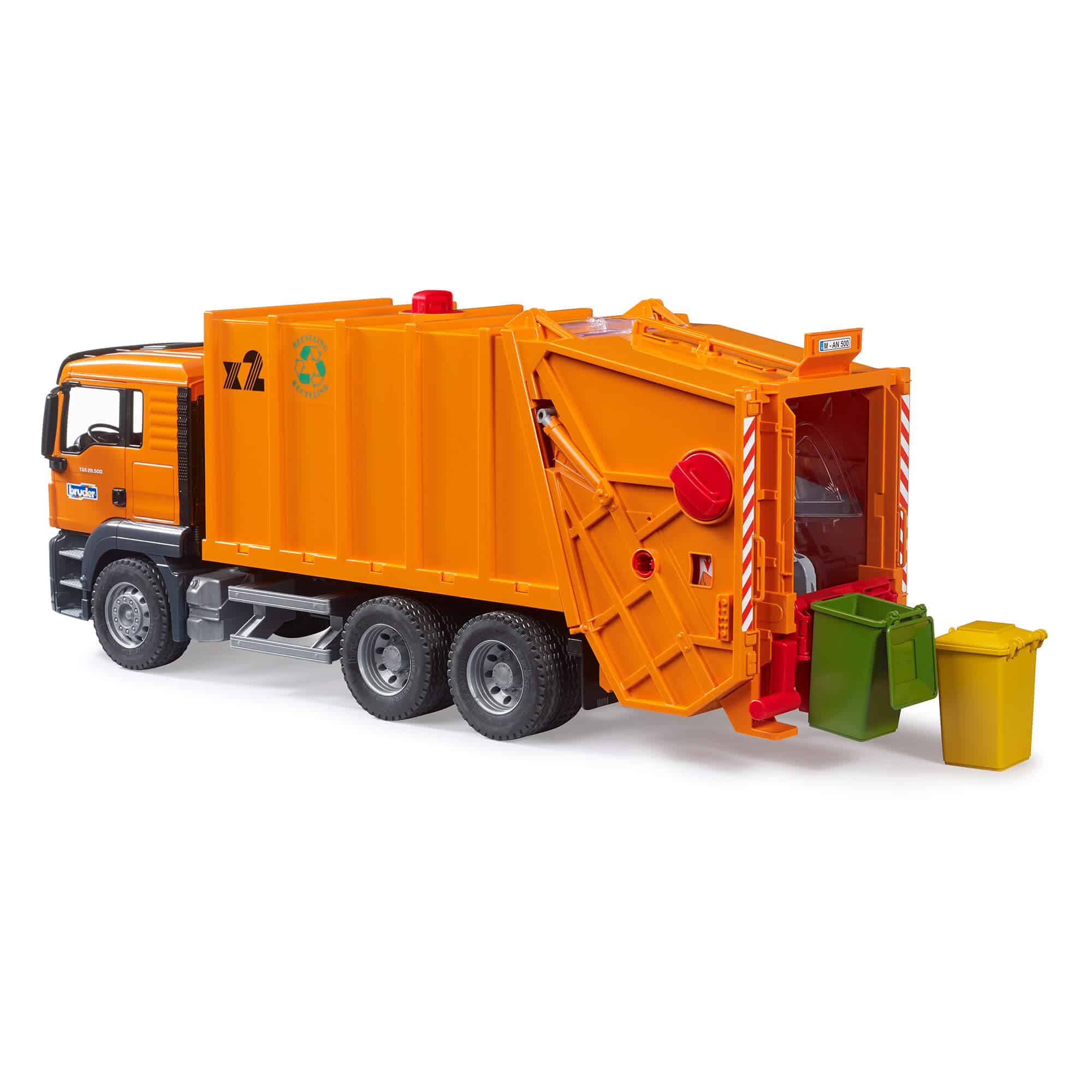 The set includes two small bins and features tread tires, enhancing the realistic play experience. For those seeking an even more comprehensive waste management adventure, the MAN TGS refuse collector vehicle can be equipped with the additional bin set (item no.: 02607).