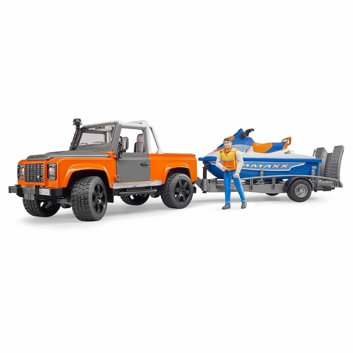 • Includes Land Rover Defender Pickup, bworld figure (wearing vest), trailer and watercraft/speedboat.