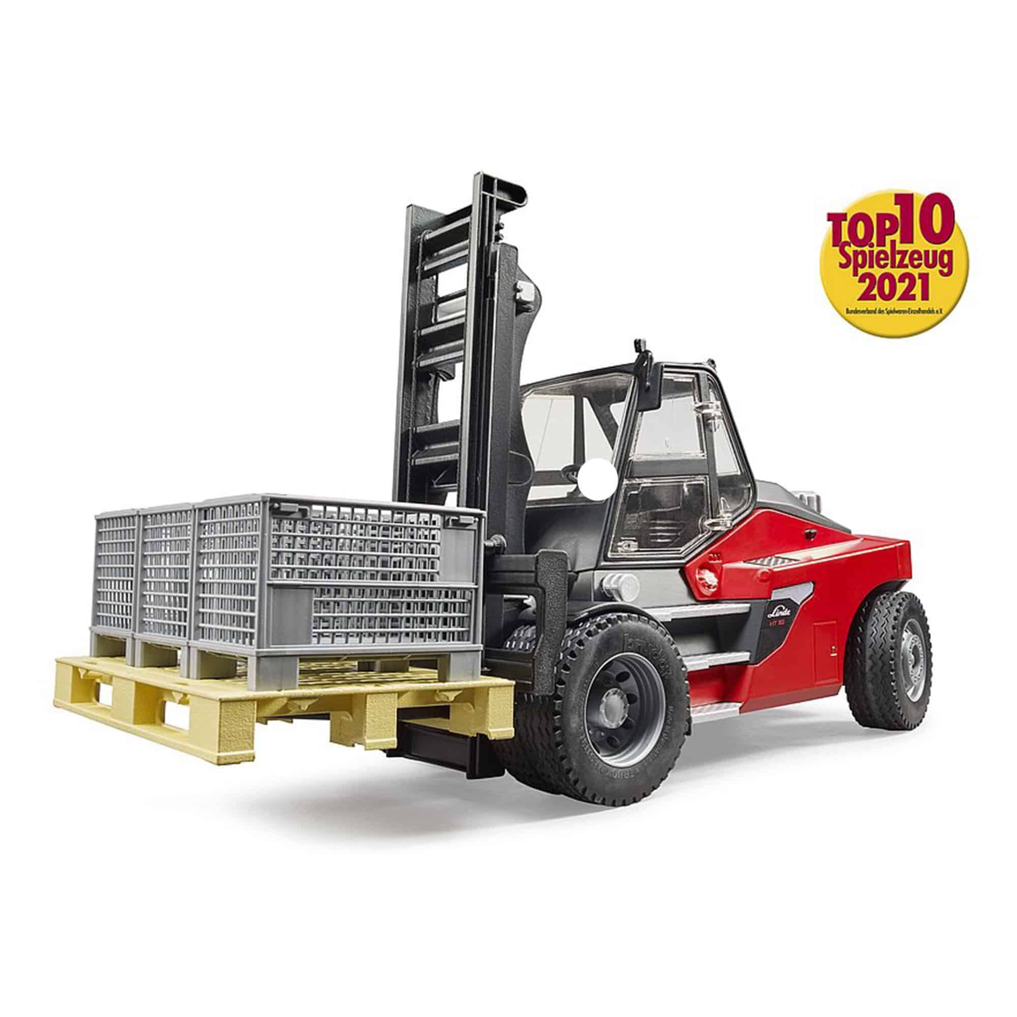 Bruder Forklift Linde HT160D stacker with pallet and 3 pallet cages (02513)