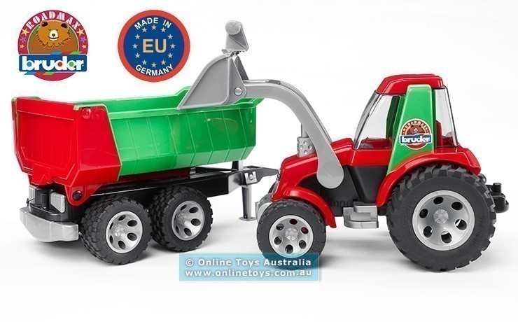 The ROADMAX series of vehicles are designed and engineered with younger children in mind. This Bruder Roadmax Tractor features a front loader to scoop up sand and debris and then empty straight into the the trailer for extra fun. Use the tractor to pull the trailer along and then dump the load using the rear tipping function of the trailer. With its tilting bucket, tipping trailer, transparent driver's cab opens, and sturdy construction, the Bruder Roadmax Tractor Front Loader and Rear Tipper offers great value and even better fun.