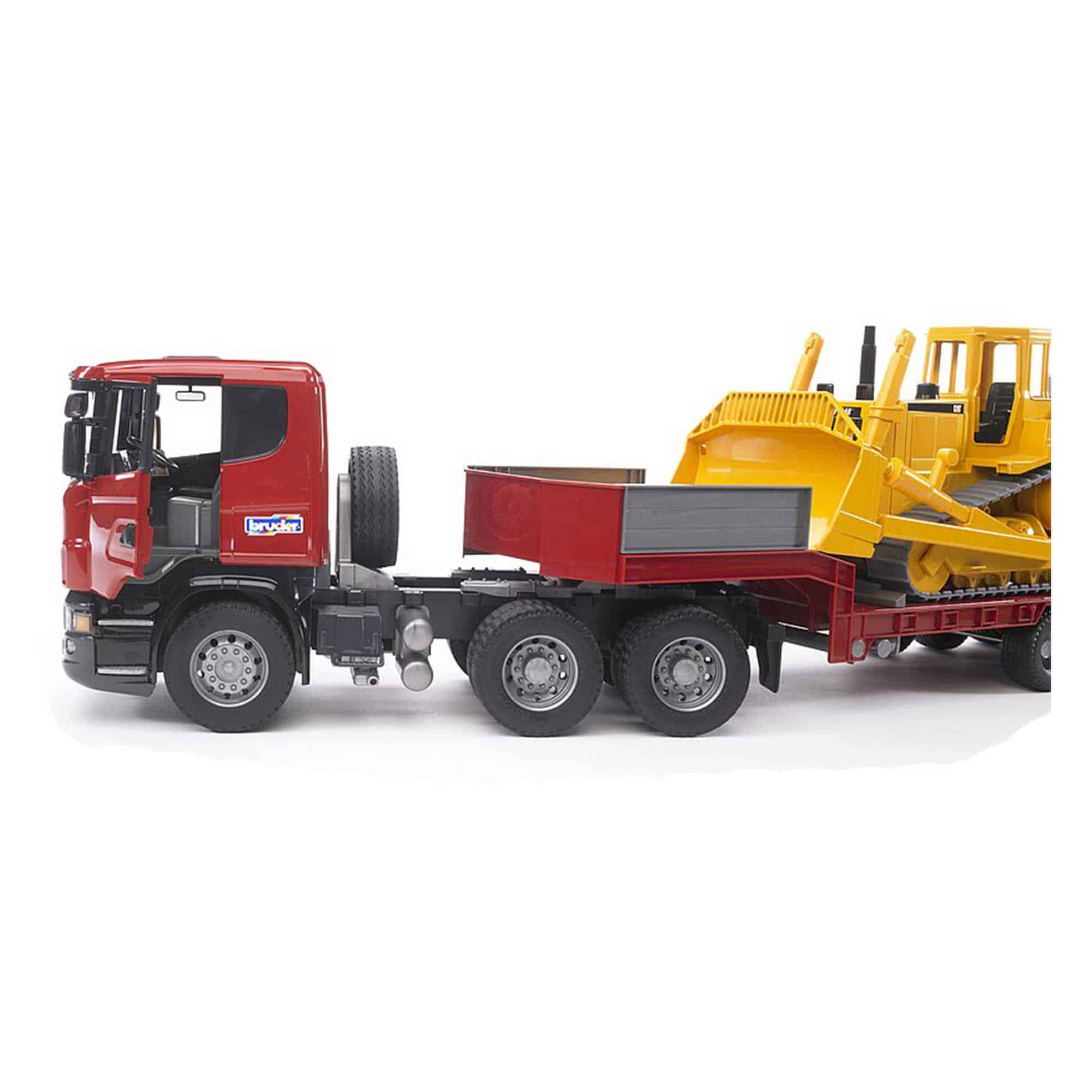 The mirrors of the SCANIA trucks can be folded in and the doors can be opened. The low loader trailer has a fully functional fifth wheel clutch and folding support legs that ensure stability. The loading ramps can be folded down and the vehicle locking device for securing the loaded vehicle can be adjusted.