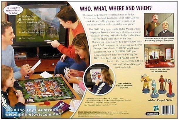 The DVD brings you inside the Tudor Manor where Inspector Brown is waiting with information on events of the day. Ashe the Butler is also there, ready to share some clues of his own. Remember to stay alert! You never know what you’ll find in a room or run across in a Secret Passage. Like classic CLUEDO you’ll make Suggestions, but in CLUEDO DVD your Accusations are made secretly using the DVD. And keep that Red Reader close at hand… there are secrets in these cases and information you’ll need to decipher.