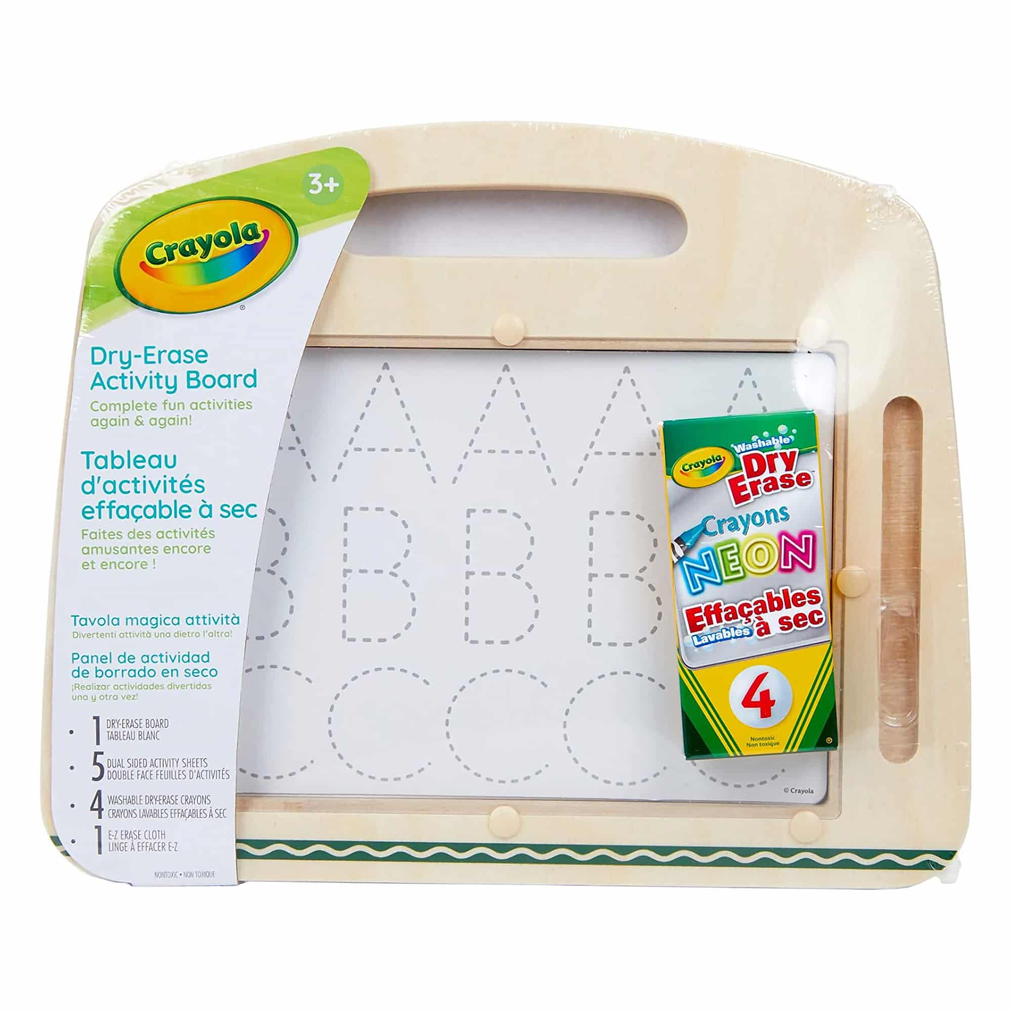 Contents: 1x Dry-Erase Board, 5x dual-sided activity sheets, 4x washable dry-erase crayons, 1x e-z erase cloth.