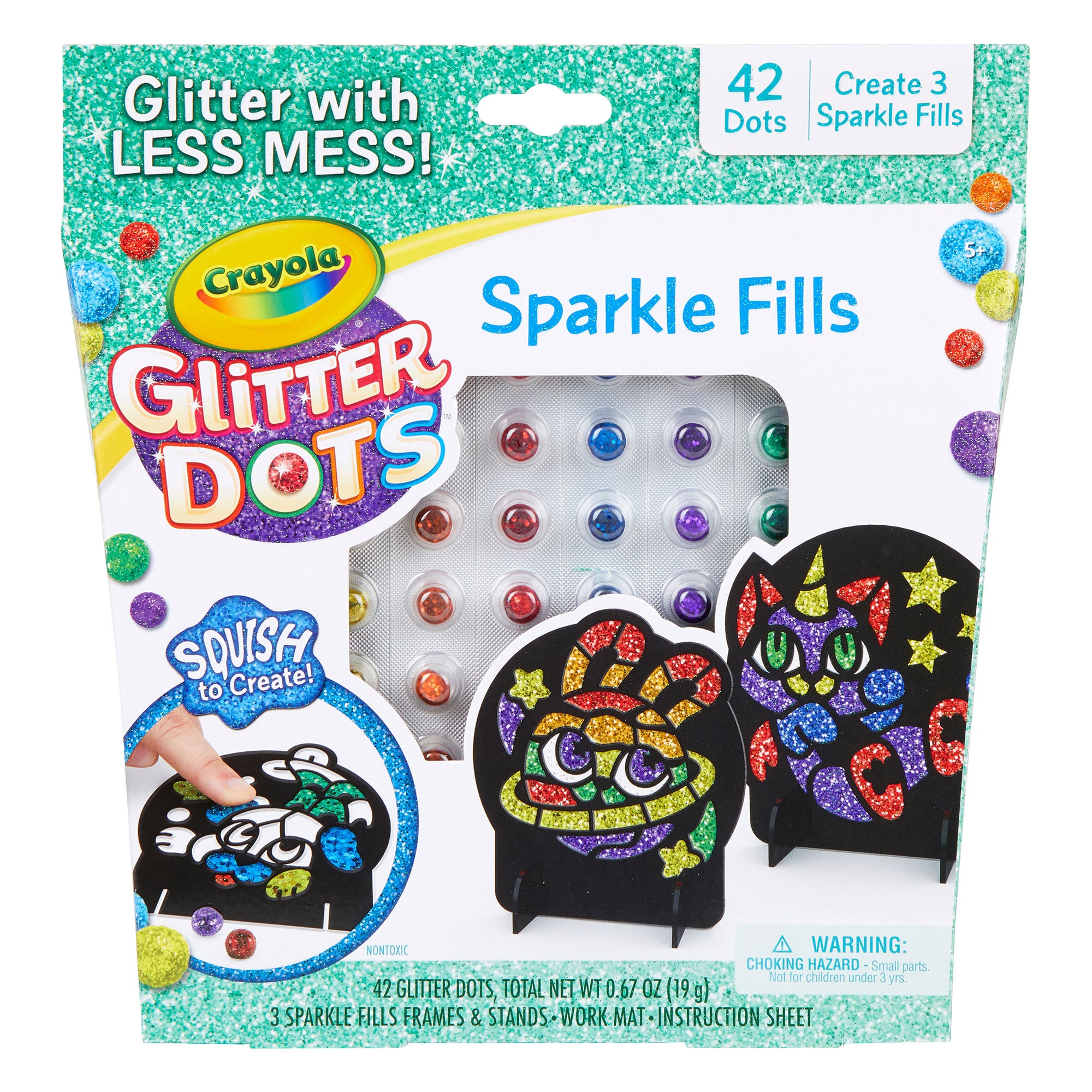 Crayola Glitter Dots offer fun glitter play in a less messy way! The glitter is contained in each dot - no spills and no sticky glue! Press dots into the included mosaic frames to add color and sparkle. Then proudly display your completed art! Comes with 42 Glitter Dots, 3 Mosaic Frames & Stands and Instruction Sheet.