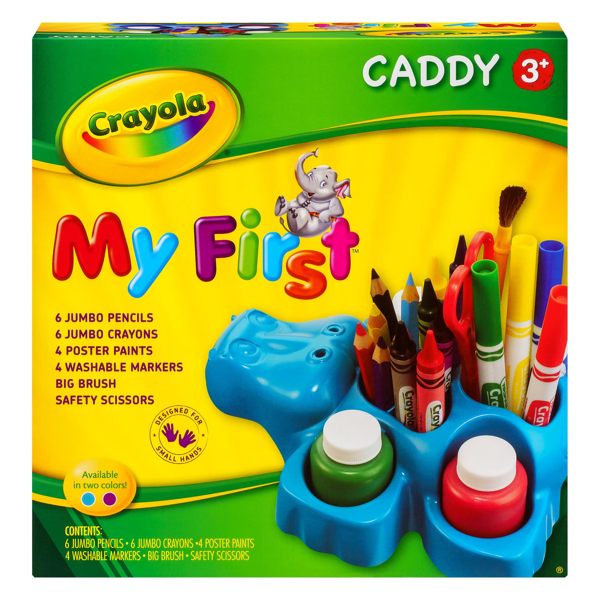 Crayola® products are specifically designed for ages 2 and up. This Junior Caddy helps hold everything neat, tidy and in one place. Comes with 1 Junior Caddy (available in blue colour only), 6 Jumbo Pencils, 6 Jumbo Crayons, 4 Washable Markers, 4 Poster paints, Safety Scissors and a big brush.