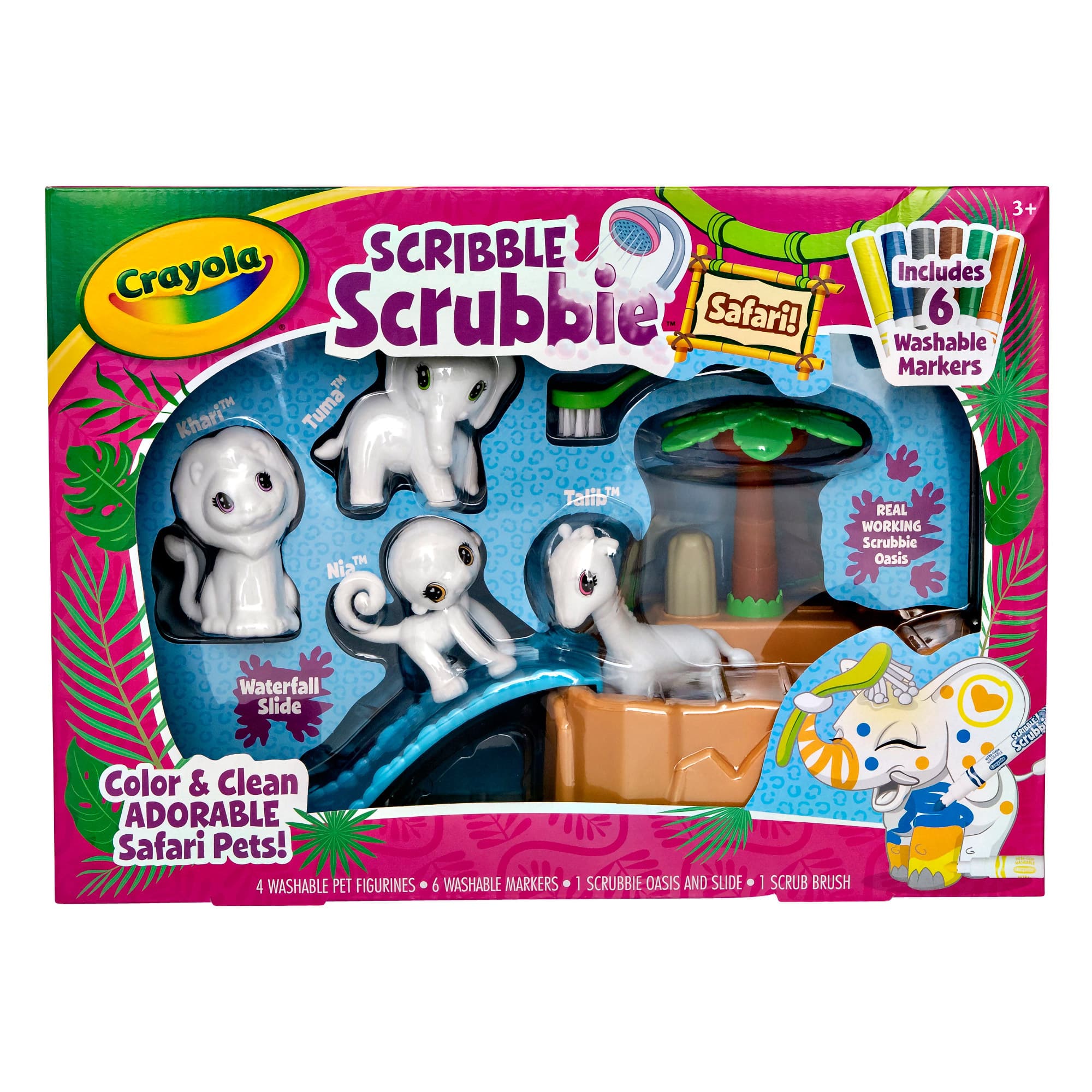 Includes: 6 Washable Colour Markers • 4 Washable Safari Figurines (lion, elephant, monkey & giraffe) • 1 Scrubbie Oasis with slide • 1 Scrub Brush.