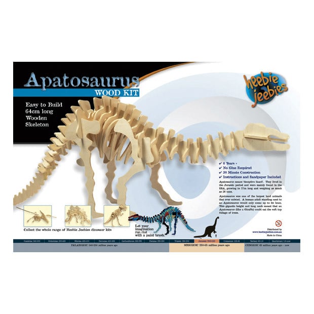 Build your own 64cm long skeleton of an Apatosaurus using precision cut pieces of wood. Then use some paint and a paint brush (not included) to bring your Apatosaurus to life! No glue required.