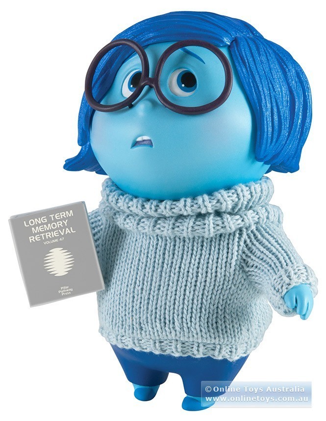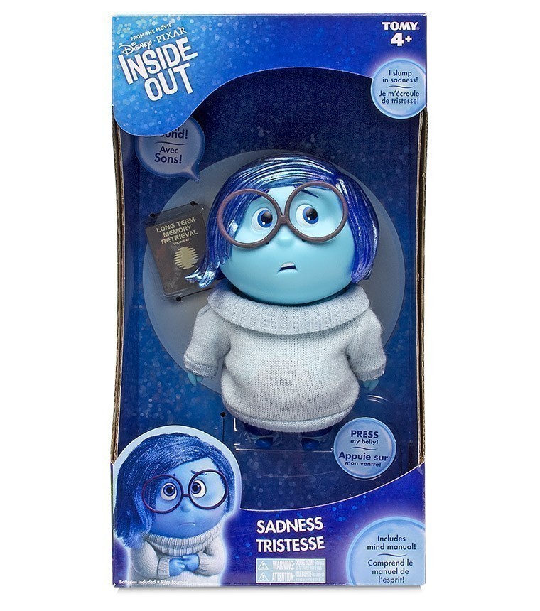 Large Sadness Figure stands at 6.5" tall and wears fabric clothes. Squeeze her belly and she will slump in sadness while saying one of six phrases from the movie Inside Out! Sadness also comes with a Mind Manual.