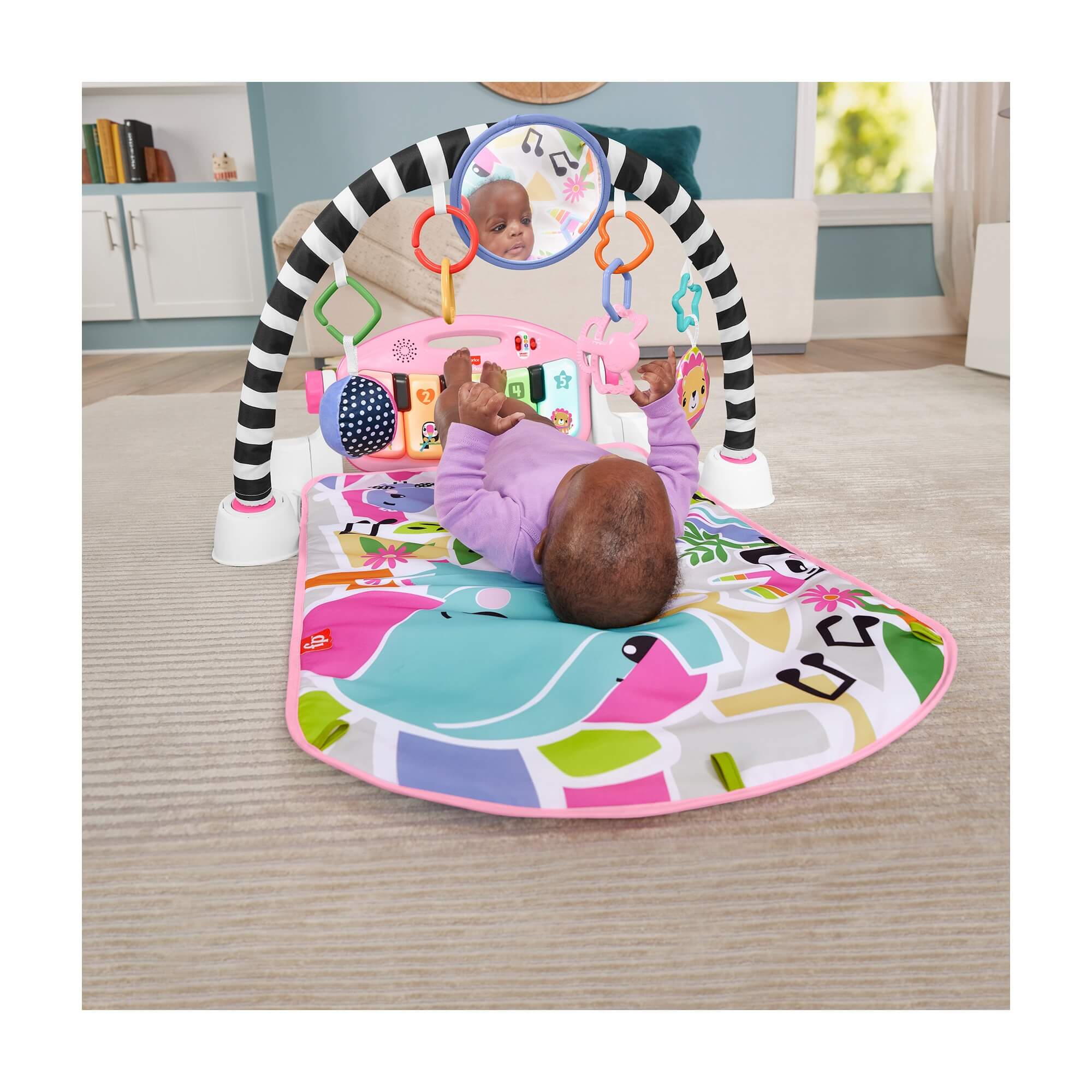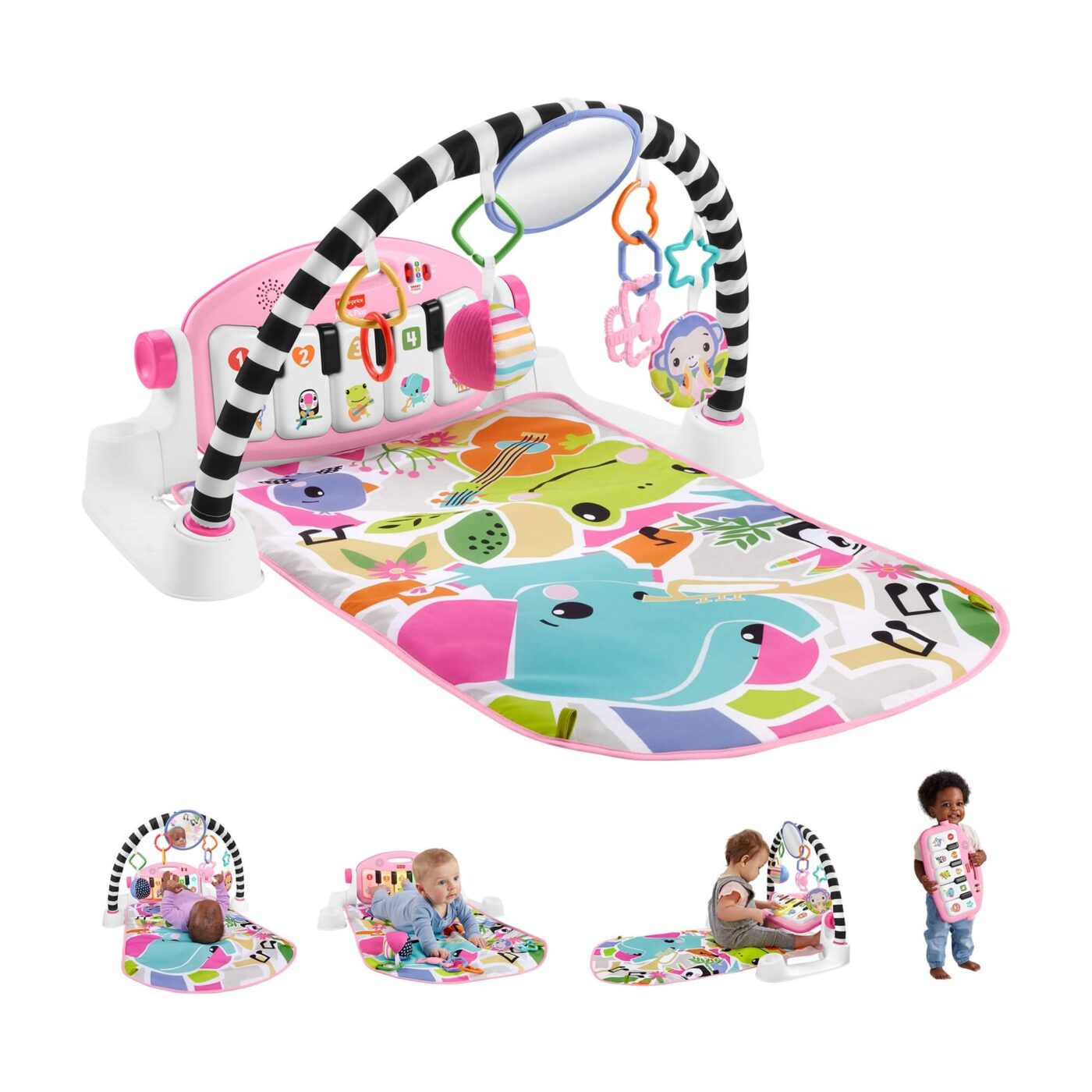 Get your little one moving and learning with the Fisher-Price Kick & Play Piano Gym! This soft playmat features a high-contrast toy arch with 10 linkable toys and a removable piano that lights up with every kick or press. Designed to grow with your baby, it offers music, lights, and Smart Stages™ learning from newborn to toddler.