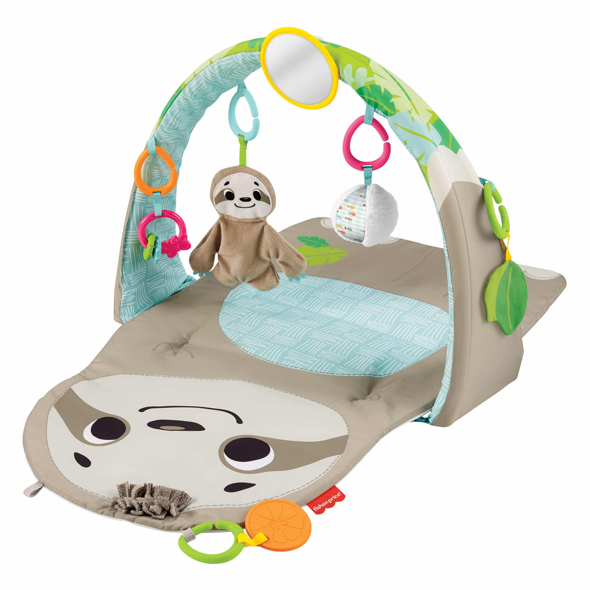 Hanging out with this sloth friend is an enchanting experience where anything can happen. Clouds jingle, butterflies clack, leaves crinkle. There’s a baby sloth to high five, a mirrored sun it's okay to gaze into, and even a chewy orange, which is great because snacks are important. The Ready to Hang™ Sensory Sloth Gym from Fisher-Price is loaded with sensory play for your baby to explore as they lay and play or push up in tummy time. The machine-washable sloth playmat has an overhead arch and six removable toys to bat, rattle, cuddle and teethe. This gym pal helps your baby work those neck and core muscles while engaging their visual, auditory, and tactile senses.