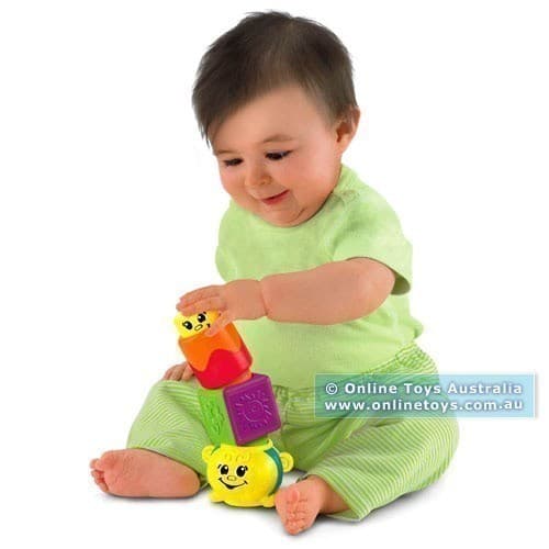 Baby can easily stack blocks on the friendly rattling bee, then bring them to life. Smiling faces pop up to delight baby with surprise peek-a-boo action! Includes one rattling bee block and two peek-a-boo, pop-up blocks.