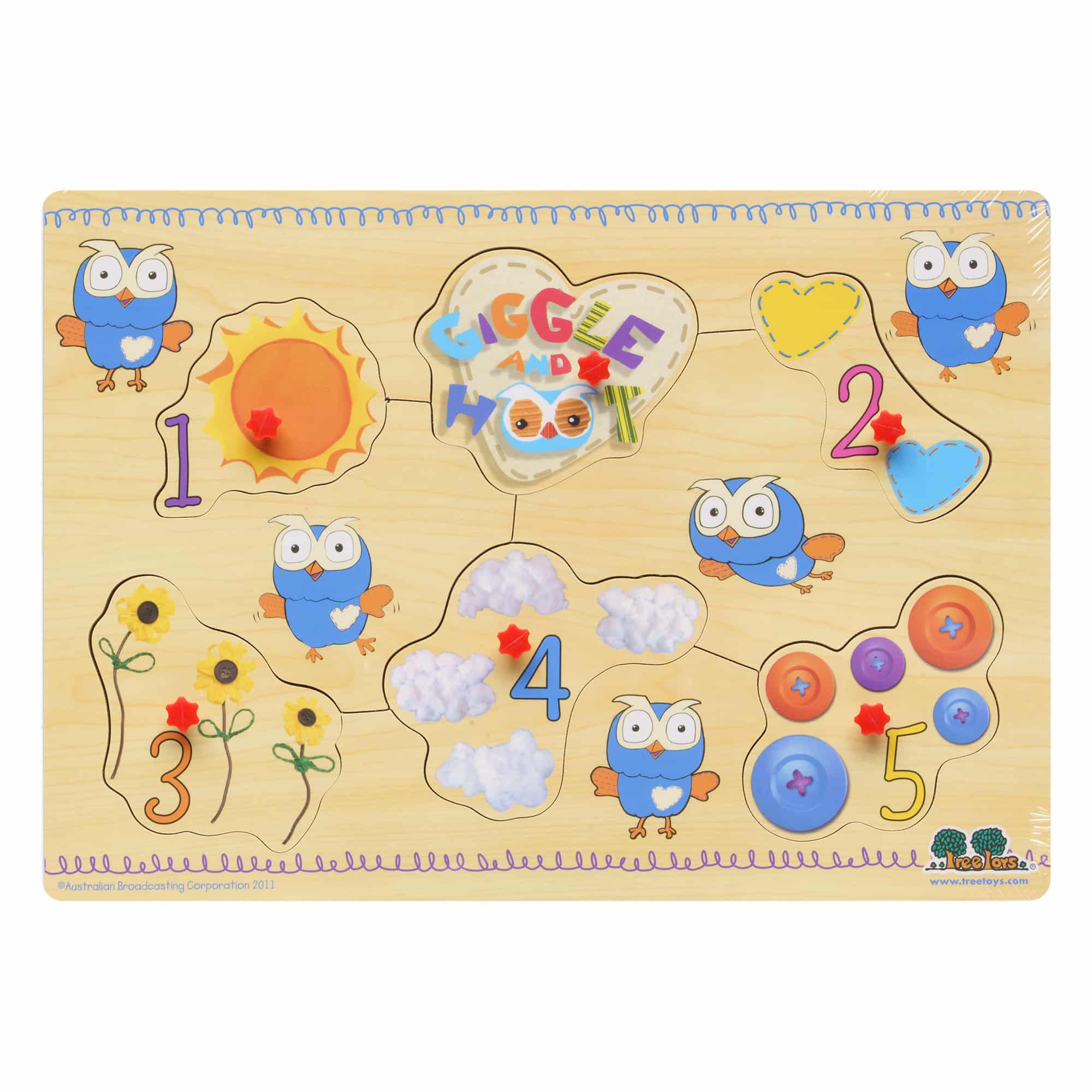 Giggle and Hoot wooden puzzle consists of 6 peg pieces featuring numbers from 1 through to 5 and of course Hoot from the hit ABC show “Giggle and Hoot”. Can you place the correct pegs in the right holes? Puzzle size: 29.5cm X 21cm