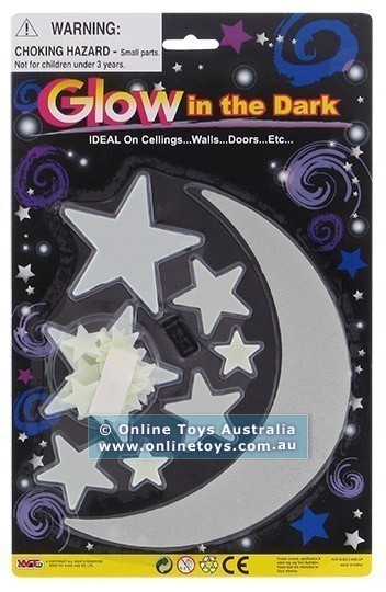 Turn off the lights and watch these glow in the dark stars and a quarter moon glow in the darkness! Plastic glow in the dark objects magically glow in your bedroom, play room, TV room or any other room in the home. Pack includes 23 stars of varying sizes (from 2.5cm to 8cm), a quarter moon measuring 21cm and to fix the stars and moon to walls and ceilings, a strip of blu-tack® is also included.