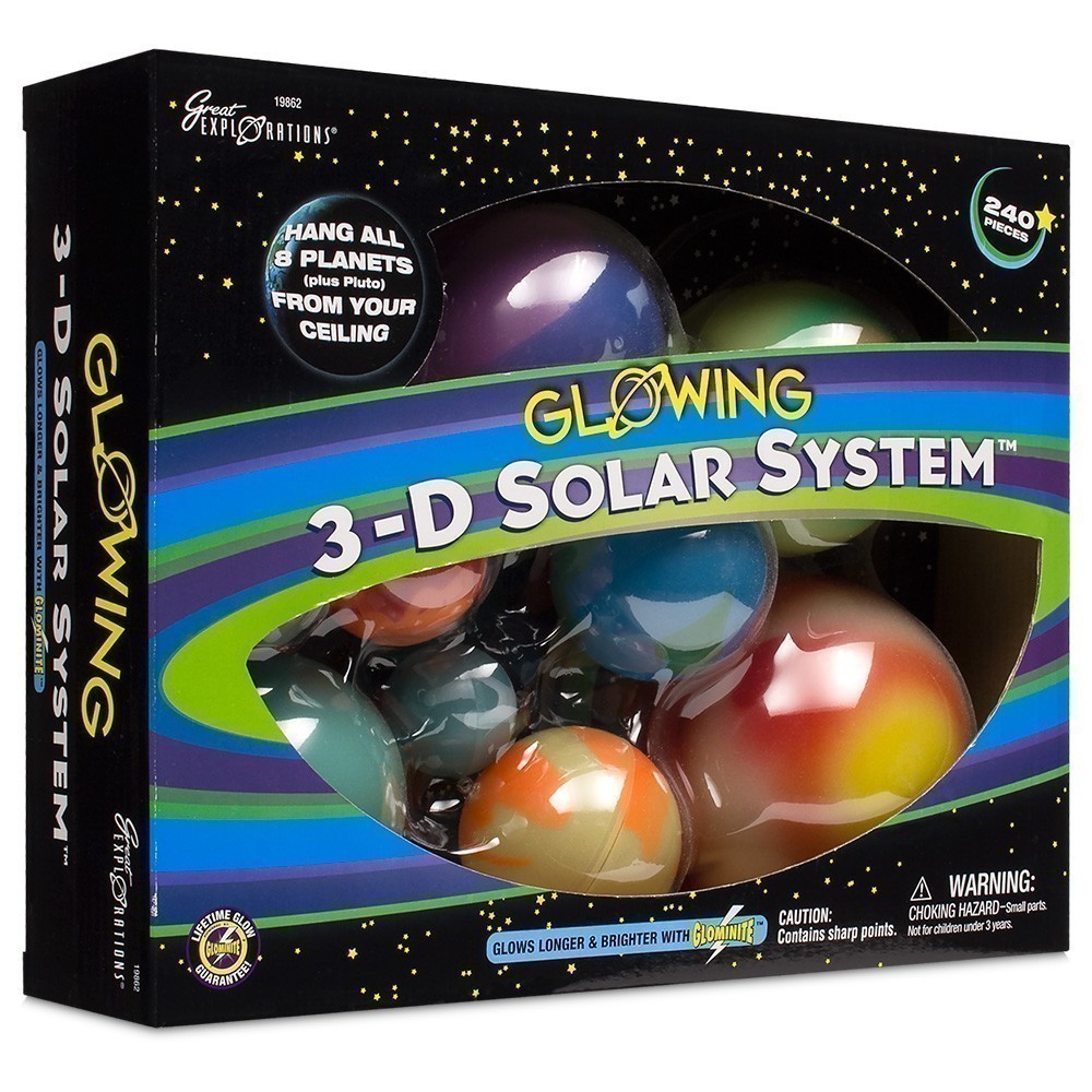 What a stellar set! Bring a splash of science to your decor with these gleaming planets and stars. A special phosphorescent formula will give your universe long life and all the accessories you need to hang and stick everything into place are included in the kit. Comes with eight glow-in-the-dark planets plus Pluto, 25 feet (7.6m) of string, 230 glow-in-the-dark adhesive stars and a planetary guide.