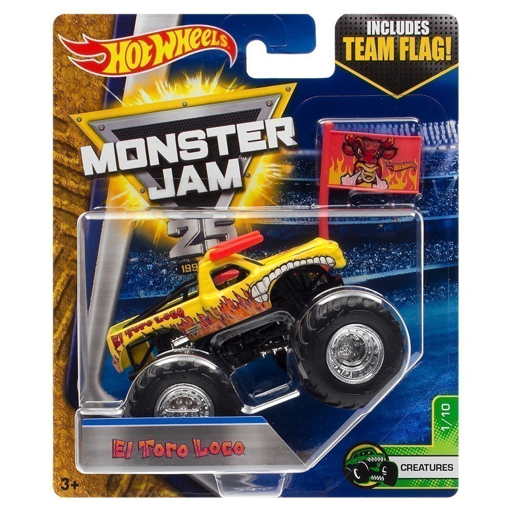 Contents: Includes 1 X Hot Wheels® 25th Anniversary Monster Jam® El Toro Loco monster truck, 1 x Team Flag.