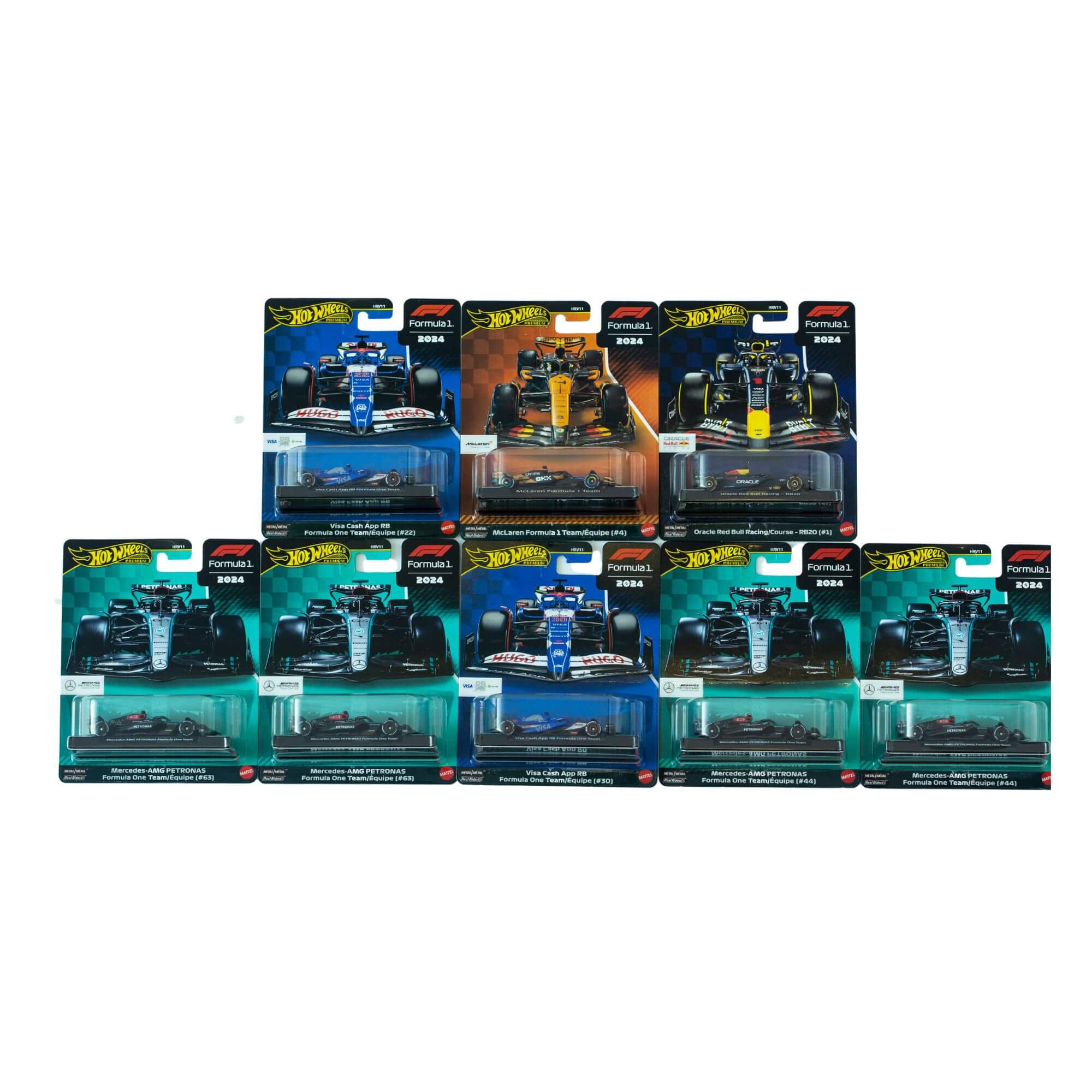This full set contains 8 premium Formula 1 cars made up of 6 different models, exactly as shown on the official Hot Wheels 2024 cards.