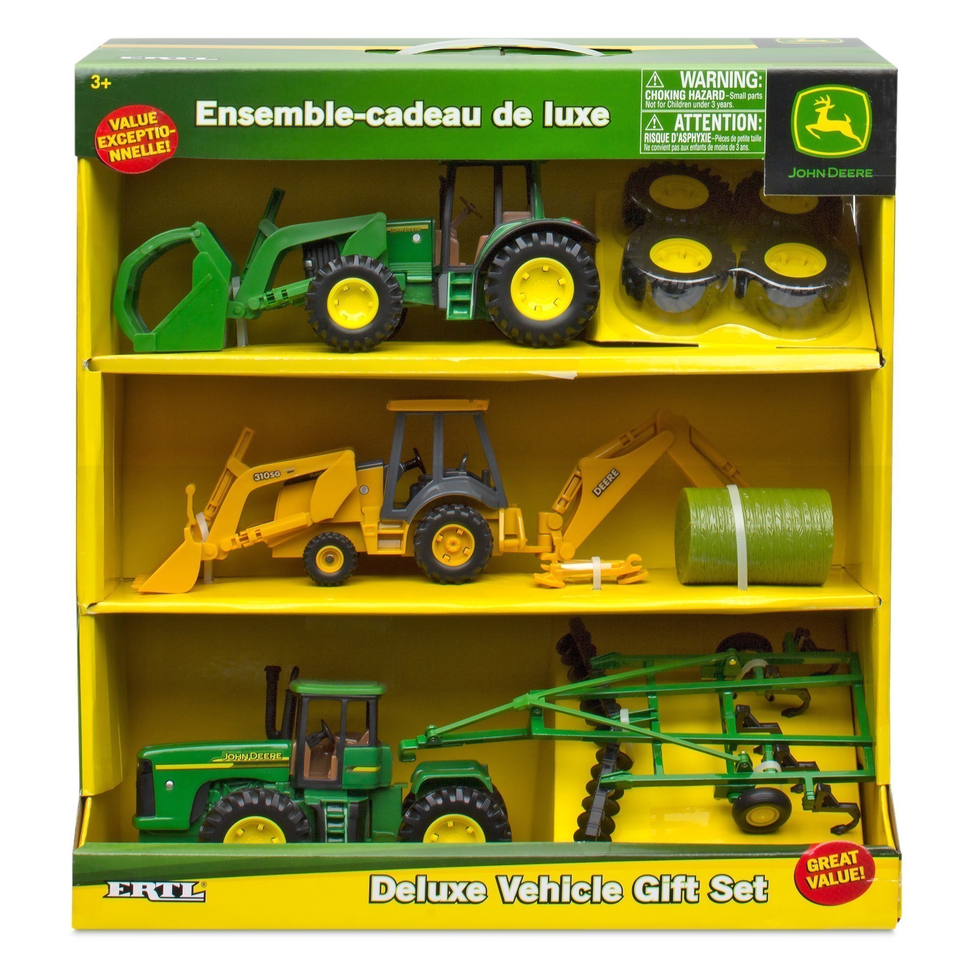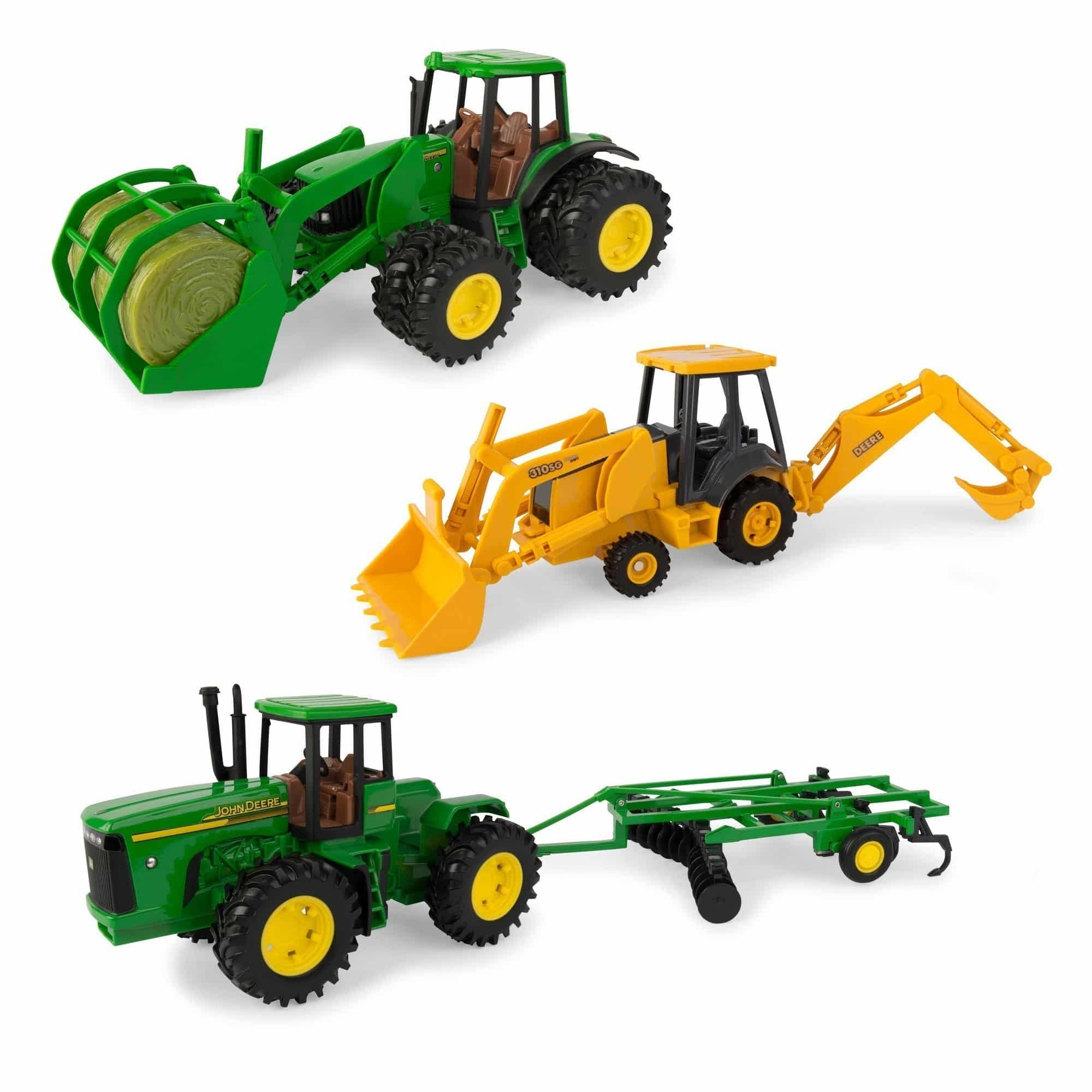 Play the role of a busy farmer with this set of John Deere® farm and construction vehicles. Inside this impressive Deluxe Vehicle Gift set you'll find a tractor with grapple fork and hay bale, a backhoe loader with outriggers and a 4WD tractor with removable dual wheels and disk ripper!