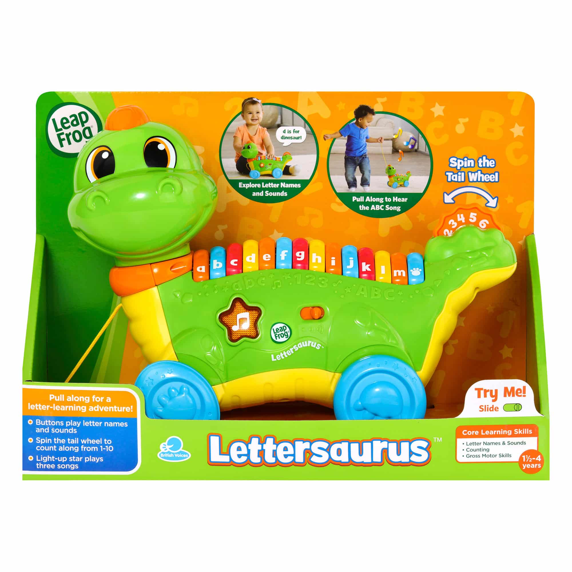 Roar, sing and learn letters! Lettersaurus is the dinosaur pal that helps little learners explore letter names, letter sounds, colors and music. Each press of the 26 colorful letter buttons on his back rewards children with a familiar tune, and pressing his head lets them sing along to the Alphabet Song. You can even make letter learning a personal experience by adding in the first letter of your child's name!