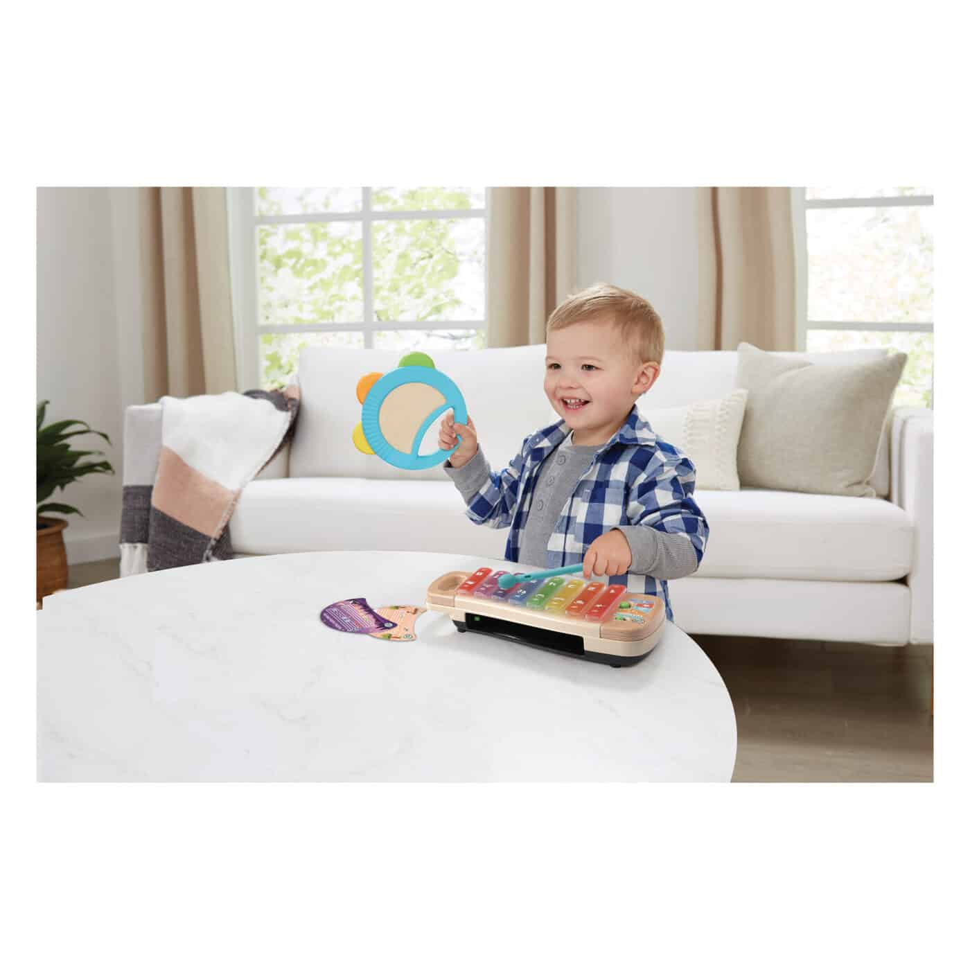 Hear first words about numbers and colours, or play notes to hear xylophone, glockenspiel and strings sounds. Jam along to nine original tunes! Hand the removable tambourine to a friend, then tap the xylophone with the mallet and play together.