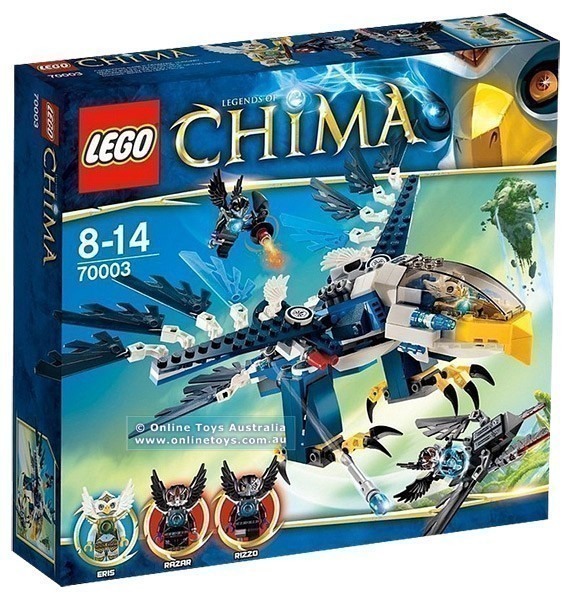 Alert the Eagle tribe! Razar and Rizzo have the Eagle tribe's CHI and are escaping on the winged raven glider! Launch Eris' Eagle Interceptor and go after those bird bandits! Use its realistic beak, poseable wings and legs, grabbing talons and tail to launch an aerial counterattack! Engage the cool attack pose and fire the missiles to bring these bandits down or capture them and throw them in the onboard prison! Then deploy the eject function to fly off and fight another day. Includes 3 minifigures and assorted weapons.