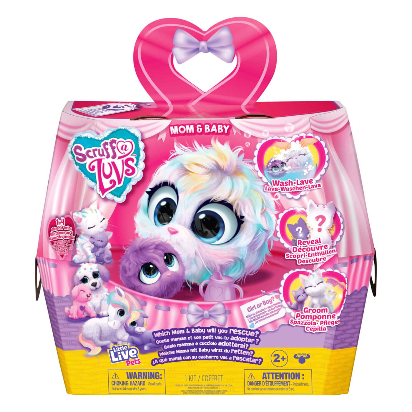 Inside the box, you'll find a mystery pet mom and baby waiting to be rescued. Will you find a Scruff-a-Luvs Dog, Cat, or Bunny family? Your Scruff-a-Luv pet arrives as a sad ball of matted fur, but once you bathe them to reveal their true fur color, dry, and love them, you will discover what kind of pet they really are!