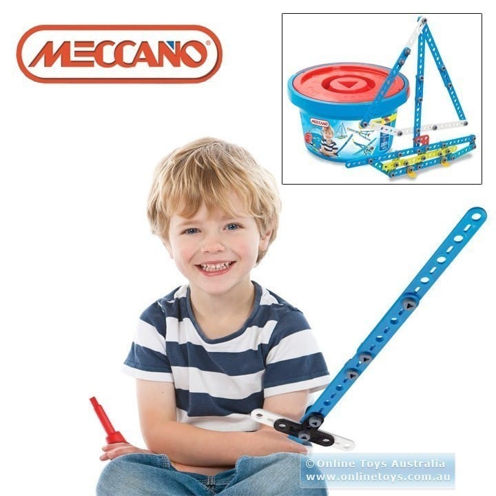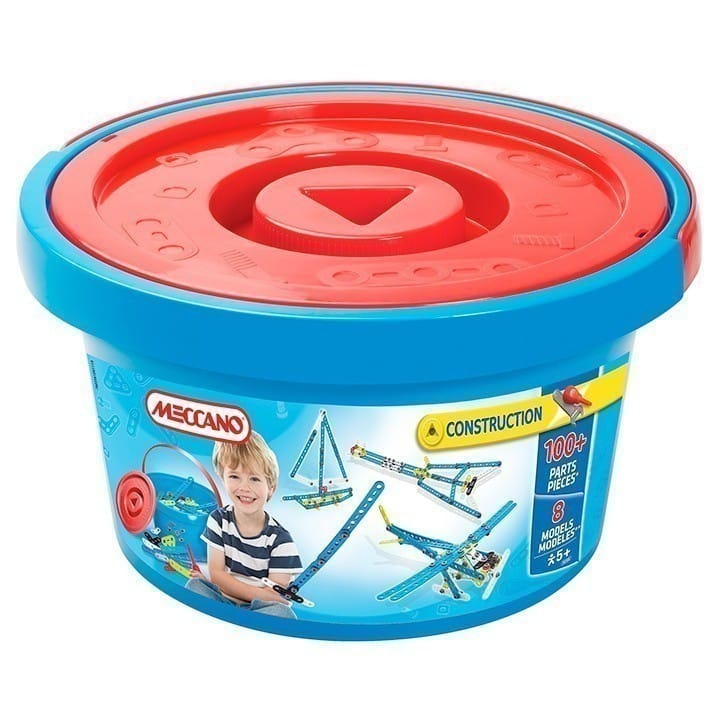 Young builders can learn how to use Meccano tools and follow instructions on how to attach various plastic parts to build numbers, a sword, a shield and more. Instructions on how to build 3 models are included and instructions for another 5 models can be found online at www.meccano.com or children can use their imagination and build their own. Colour-coded parts make building and following instructions both fun and easy. Included are 100 pieces and tools. Pack everything away inside the sturdy, blue plastic bucket, with lid and a built-in carry handle. Suitable for children 5 years and over.