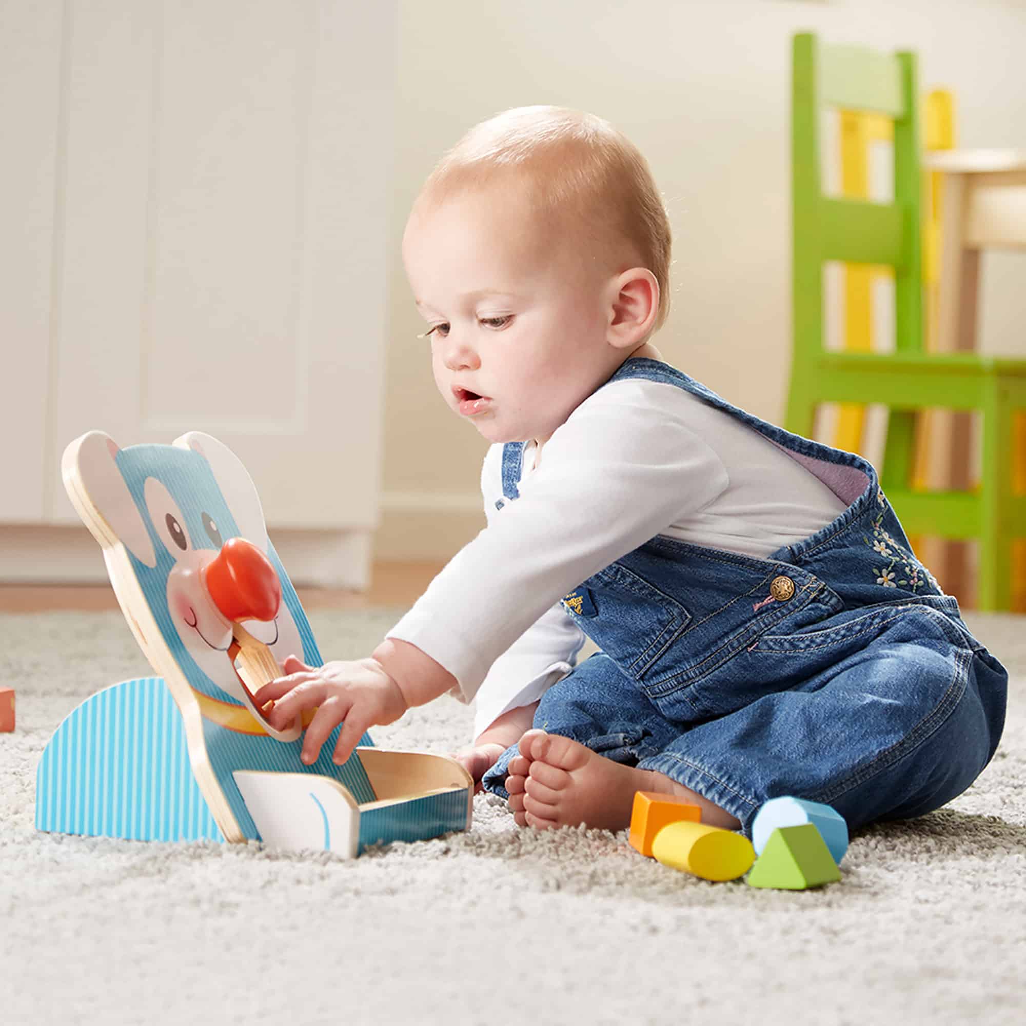 This is the perfect toy when kids are hungry for hands-on play! Spin the playful puppy's nose, then "feed" it five colourful wooden shape blocks! Babies and toddlers 12 months and older will delight in sorting and stacking the smooth, solid wood pieces that store in a tray behind the puppy.