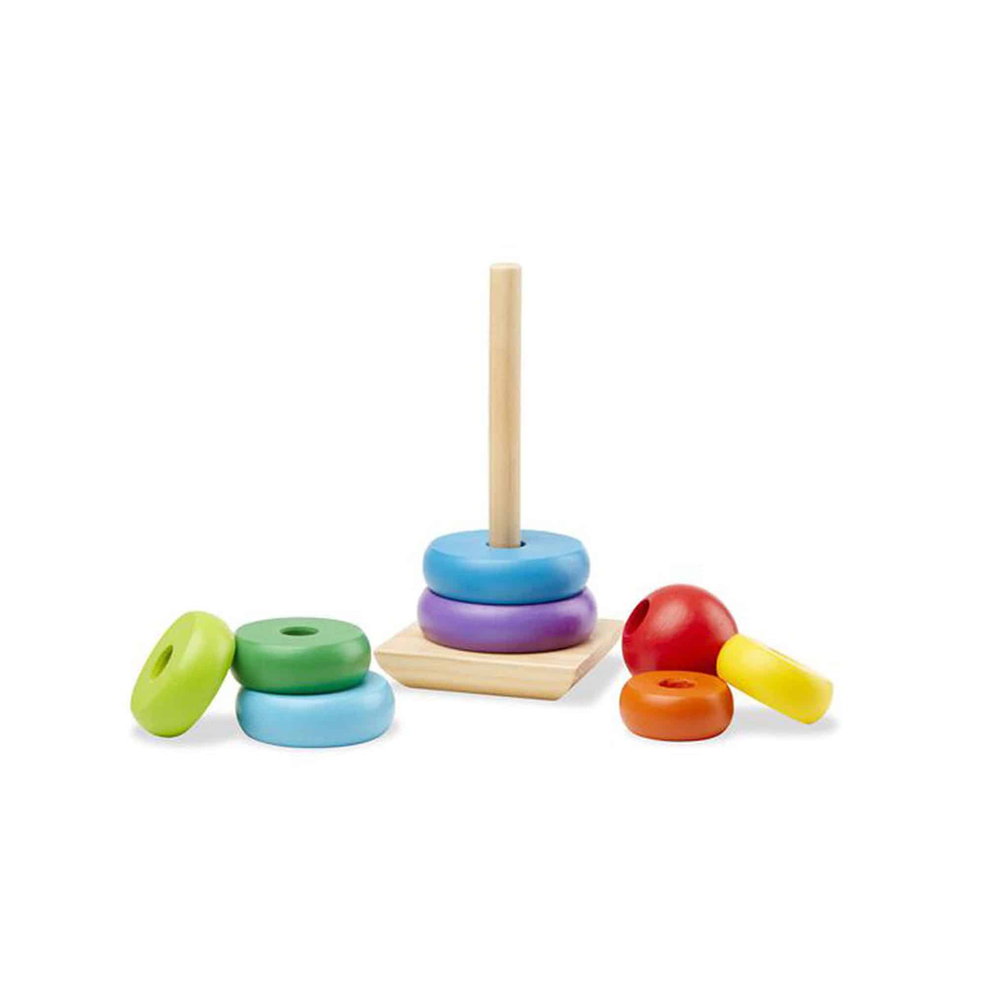 Talk about a classic childhood toy! All the colours of the rainbow are represented by these eight smooth, easy-grasp wooden pieces. Stack them on the solid-wood base, designed with rocking edges for safe and intriguing play.