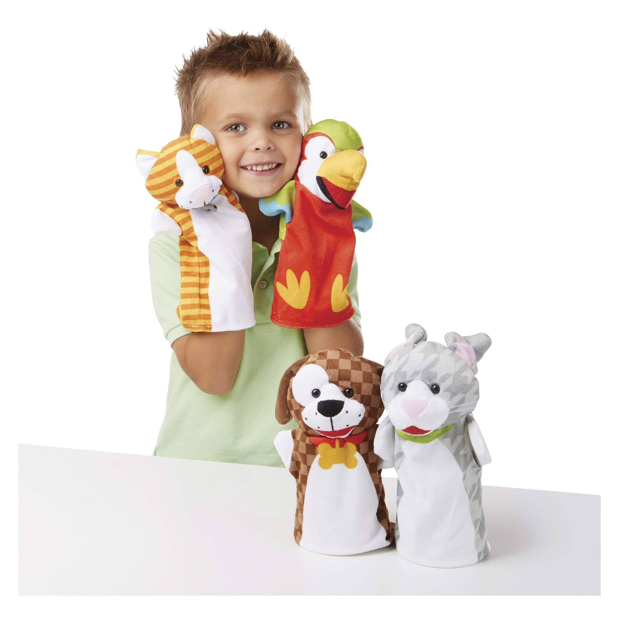 - Four soft friendly animal hand-puppets in a playful pets theme