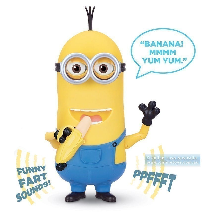 Press Minion Kevin’s pocket to hear him talk with hilarious expressions! Press the pocket again or move his head back and forth or left or right for another response or expression. Feed Kevin the banana and you will hear from the Minion how much he loves bananas! Move his head or press hi pocket after feeding him and you’ll hear Kevin make a farting sound. Kenvin’s eyes also become animated (they open, close and look around) when his head is moved left and right.