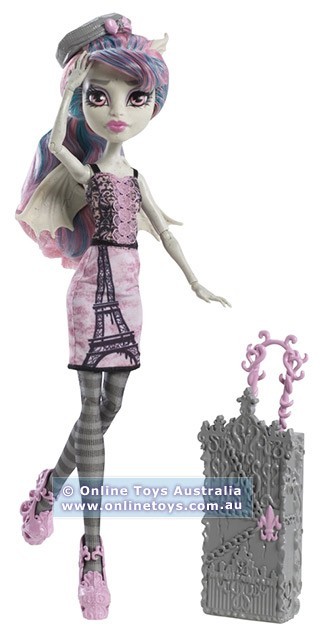 Monster Fun With Ultra-Fierce Rochelle Goyle! The ghouls of Monster High are hitting the skies for their first trip abroad together! Their destination? Scaris, The City of Frights – and hometown to Rochelle Goyle! Excited to visit her old haunts, Rochelle Goyle doll wears a traveling outfit that shows off her ferociously hip style. Plus, this gargoyle-geous doll is fully articulated, so your own ghoul can pose her in lots of exciting ways!