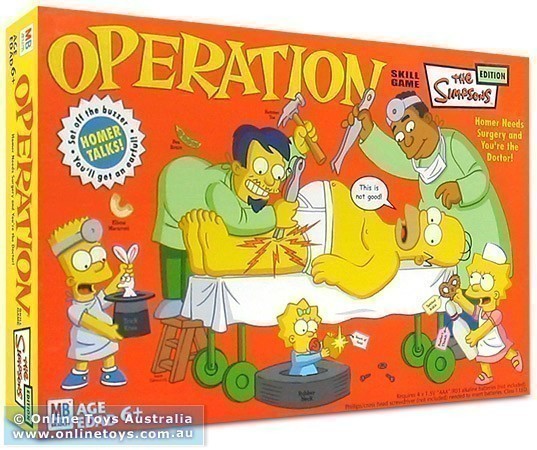 Homer needs surgery and you're the doctor! Homer's got problems: a pea brain, bowler's thumb, and more. In this classic game of removable parts, you get to be his surgeon. Can you fix him up without setting off the buzzer - and Homer's big mouth? If you touch the sides with the tweezers, homer will moan, groan, or give you a piece of his mind (like he can spare one). Earn money by performing successful operations (the nice, quiet kind, with no buzzers or backtalk). When all is said and done, the richest doctor wins! A game for 1 or more players.