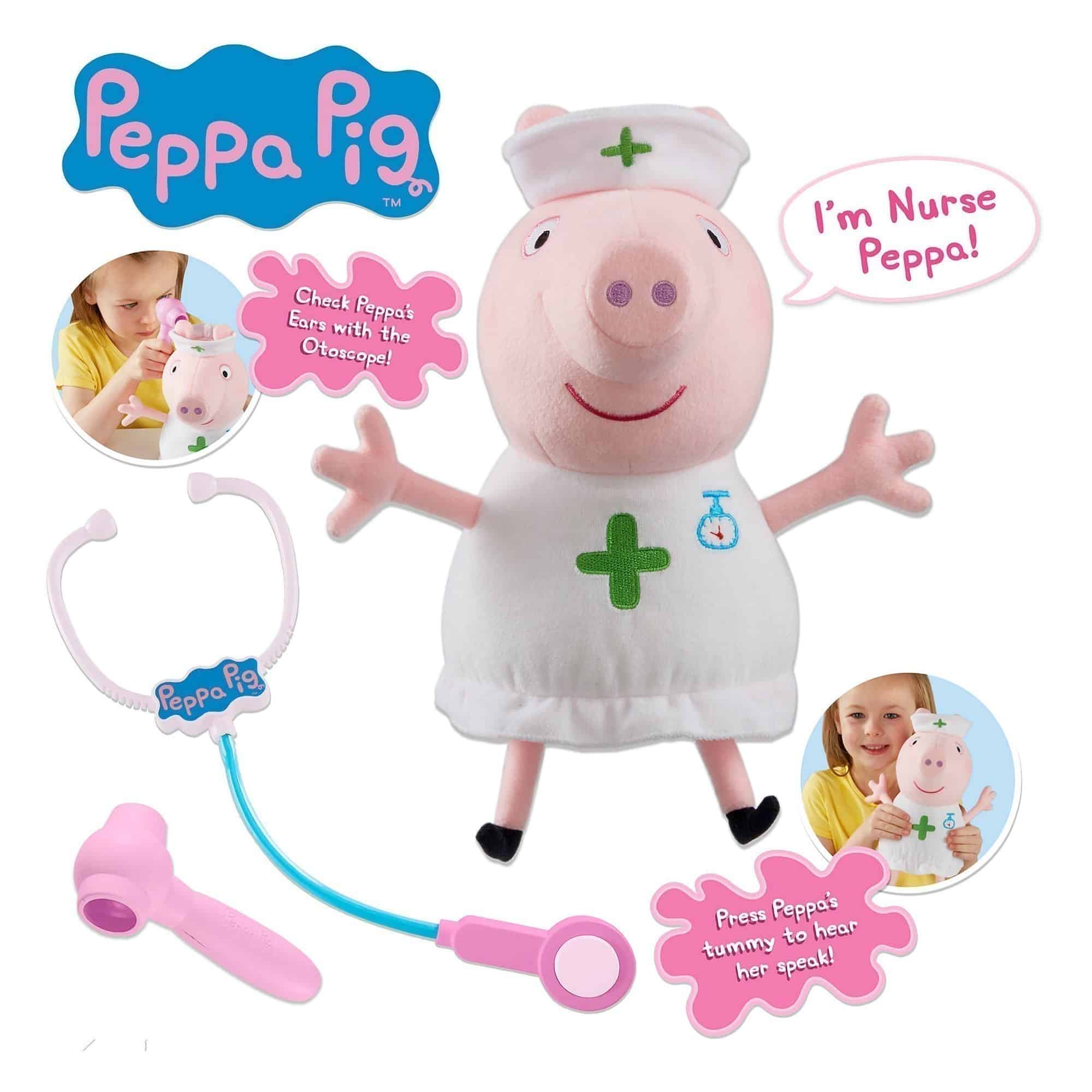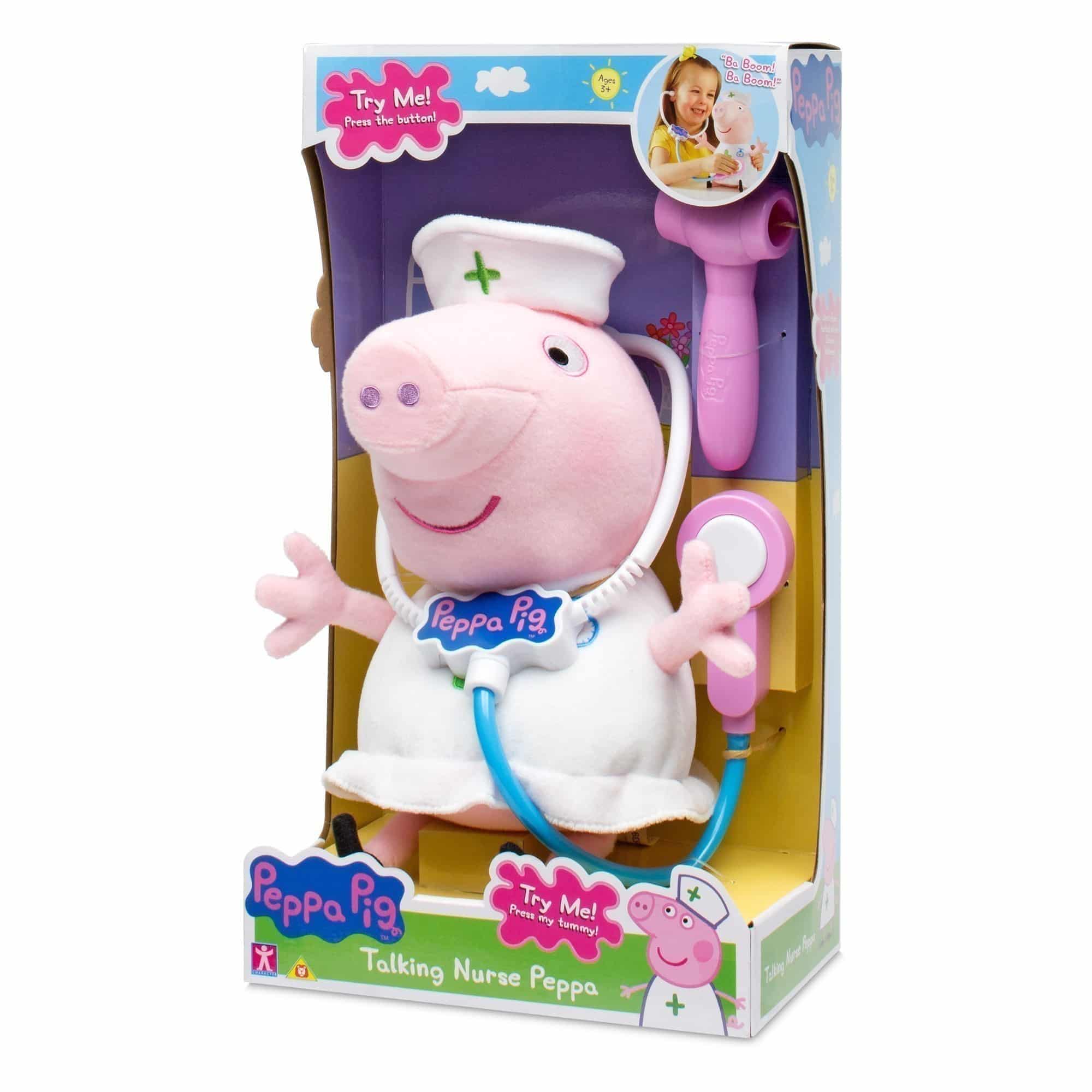 Inspire imagination with the Peppa Pig - Talking Nurse Peppa! This cuddly, interactive plush toy features fun sounds and phrases when you press Peppa's tummy!