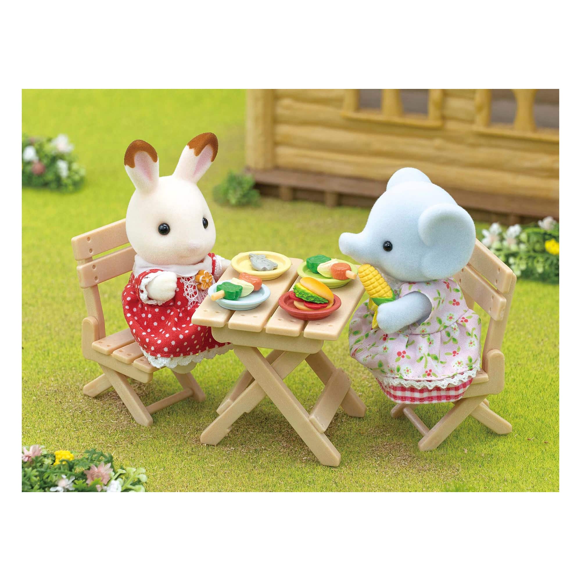 Have your figure cook food on the grill and eat at the table and chairs. Includes colourful plates and ingredients. The table and chairs can be folded up. The barbecue lid can be opened and closed.