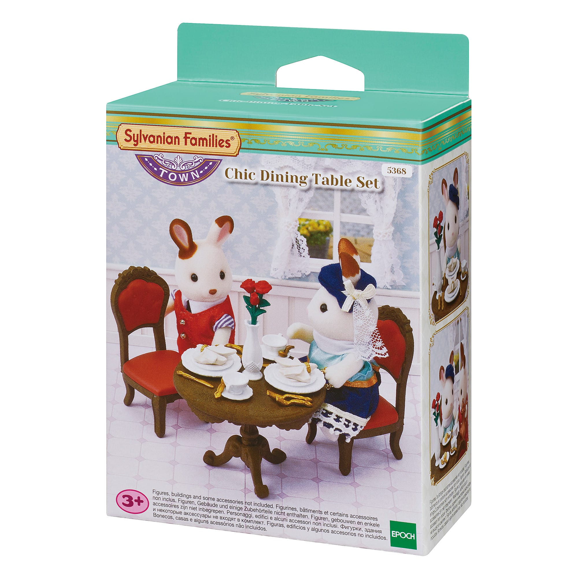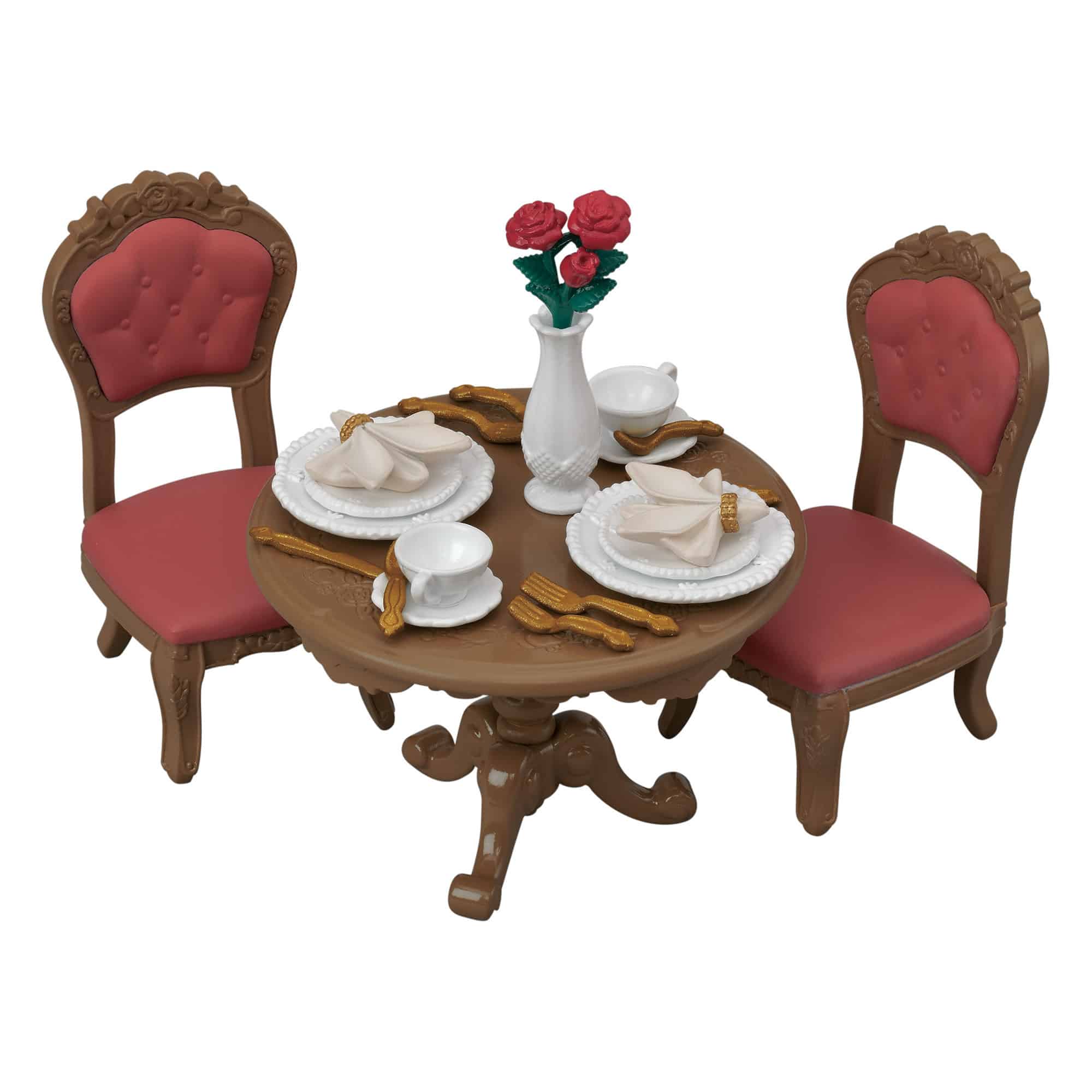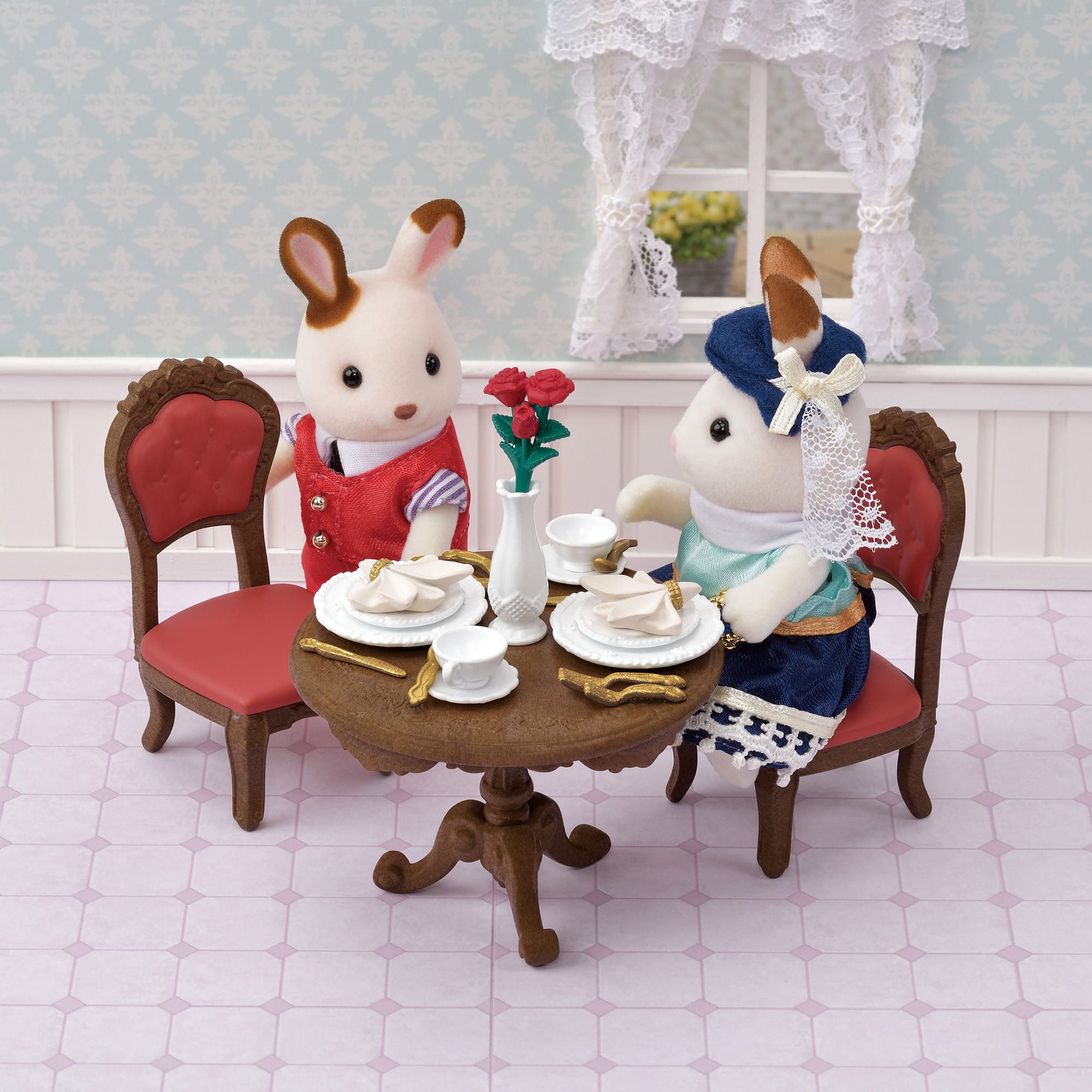 Host stylish dinner parties with the Sylvanian Families - Chic Dining Table Set! The Chic Dining Table Set includes an elegantly designed dining table, accented with elegant roses! The set comes with stylish tables and chairs, with intricate, lovely tableware set for two.