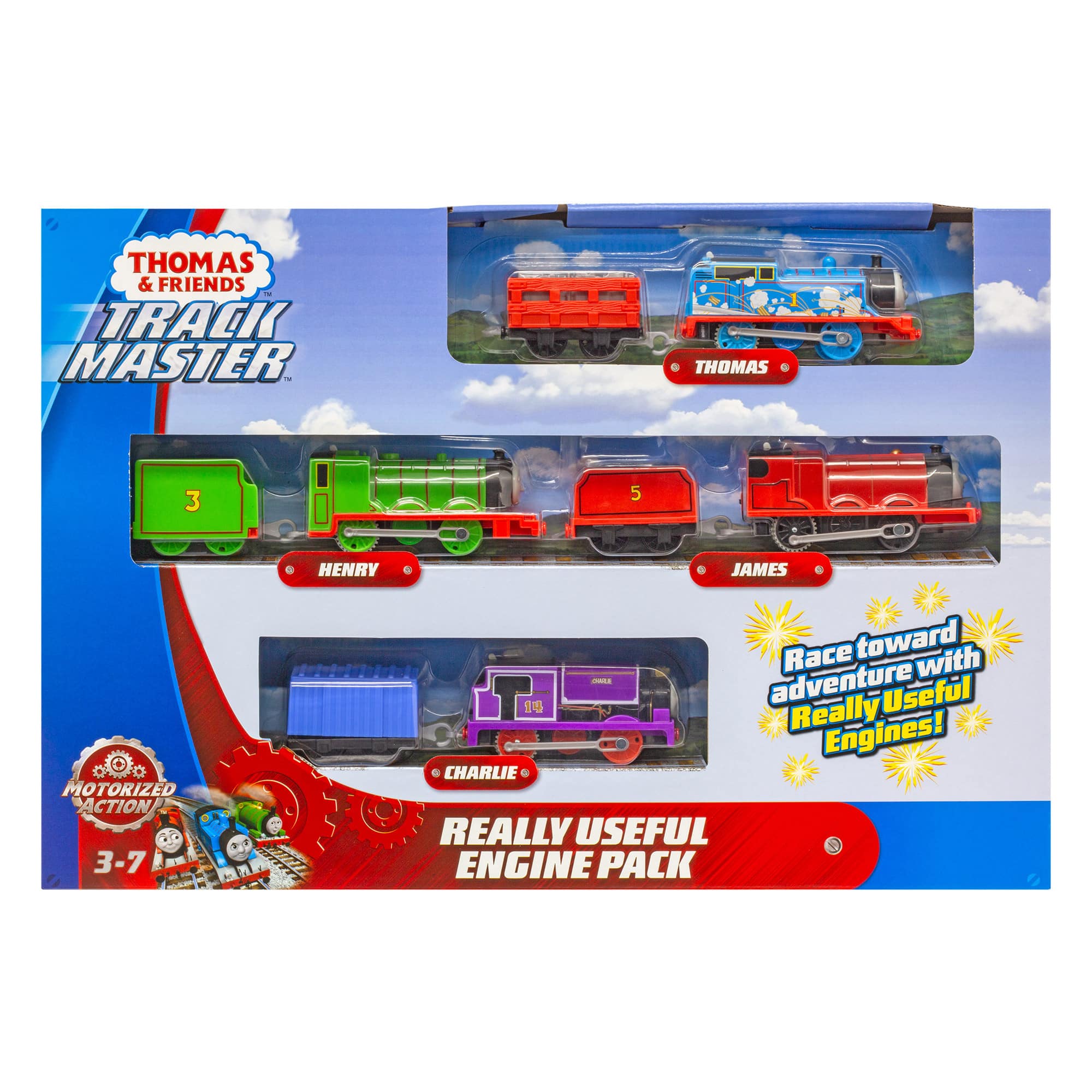 TrackMaster™ motorised toy trains from Fisher-Price® take Thomas & Friends™ to greater speeds, taller heights, and bigger adventures! Create your own railway full of Really Useful Engines, and experience the Island of Sodor like never before with this 4-pack of motorised train engines, including Thomas with an exclusive steam and spark design, James, Henry, and Charlie. Full steam ahead for exciting, motorised action!