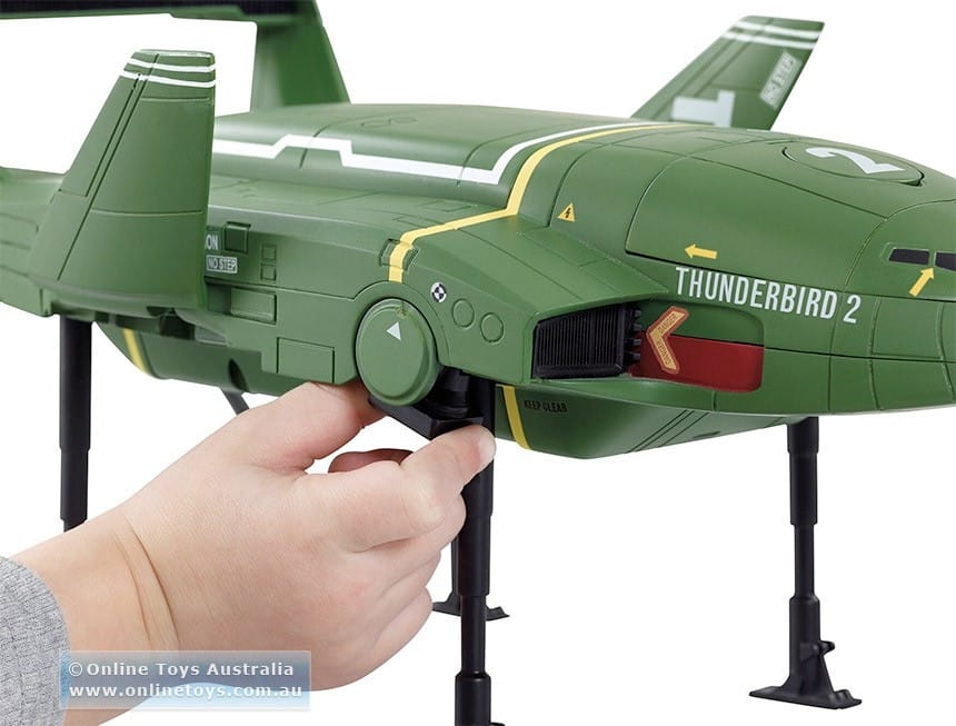 The Thunderbird 2 vehicle features 4 adjustable vtol thrusters, an accessible cockpit, retractable landing legs, fold up wings and lots of action & rescue sounds at the press of a button.