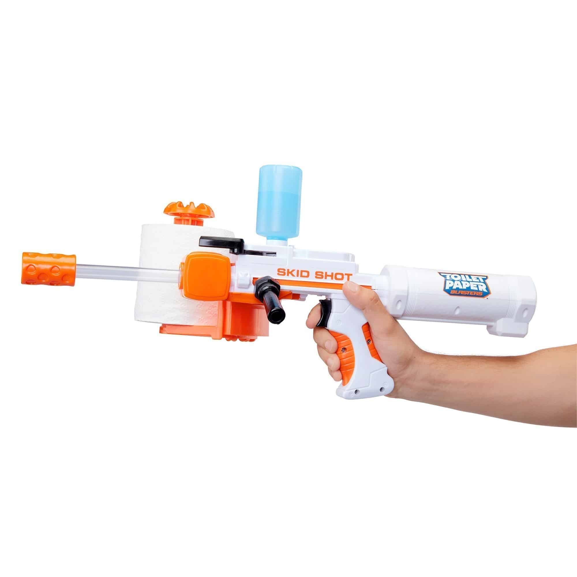 Holy Sheets! Blast & Unload tons of Fun! Blast toilet paper up to 30 feet with the NEW Toilet Paper Blasters™ Skid Shot! Transforms real toilet paper into clean spitballs! Uses water, not spit for hygienic spitballs that are bio-degradable and easy to clean up with no Skid Marks! Load the toilet paper, fill the water tank, Pull the trigger and blast away! Load of fun for everyone! Please note, some water leakage is normal during play.