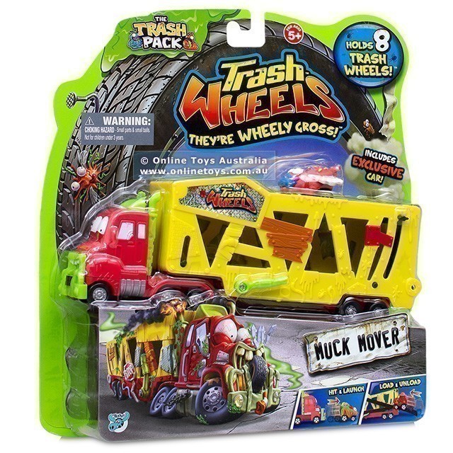 Help the Trash Wheelies make it to their grimy destinations with the Trash Wheels Muck Mover. This grubby vehicle allows kids to store their Trash Wheels collection inside of the back trailer, or transport their mobile Trashies to the dump! Place your Trash Wheelie in front of the truck and hit the button to watch it launch! Complete with one Trash Wheelie and a Collector’s Guide.