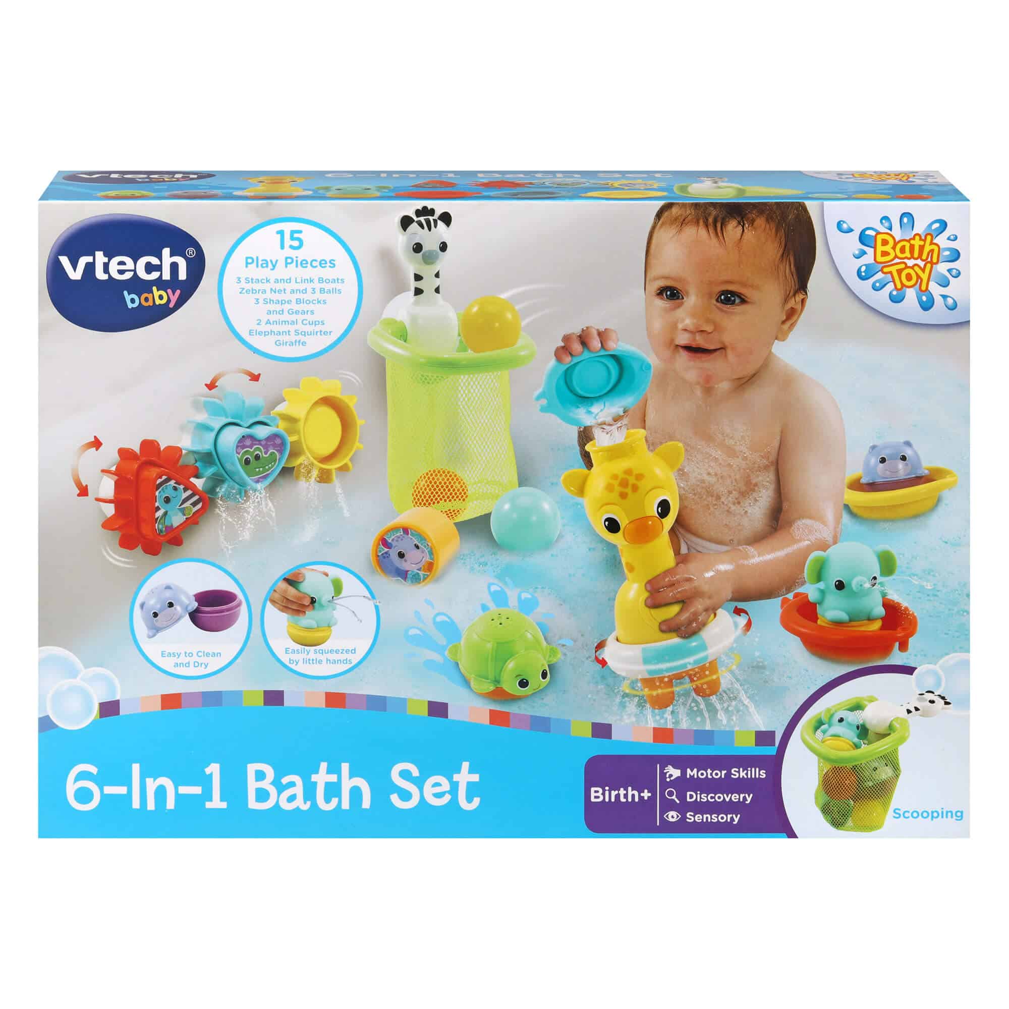 Experience the ultimate bath time adventure with the Vtech Baby 6-in-1 Bath Set Toy. This high-quality and versatile playset includes 15 play pieces to engage and entertain your little one. With 3 stack and link boats, a zebra net and 3 balls, 3 shape blocks, gears, and 2 animal cups featuring an elephant squirter and giraffe, this set offers endless possibilities for interactive play and learning.”