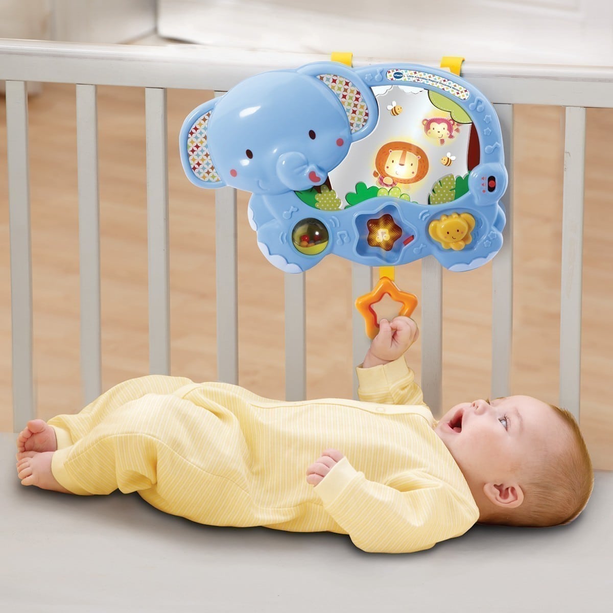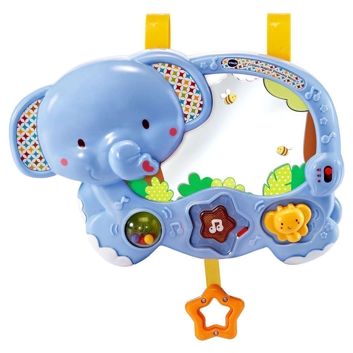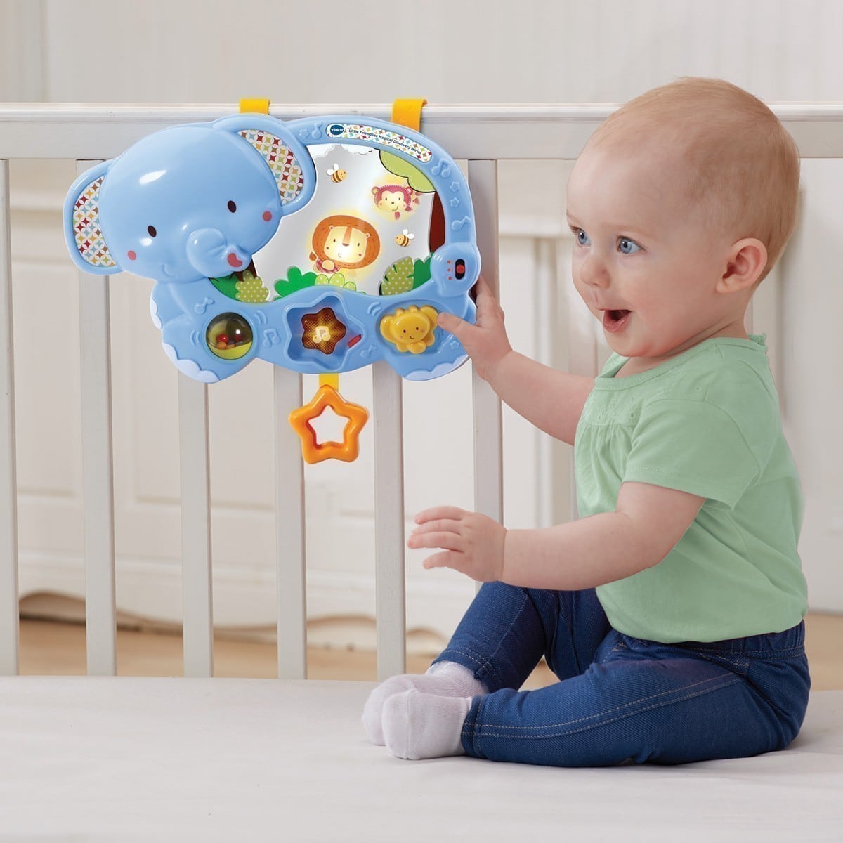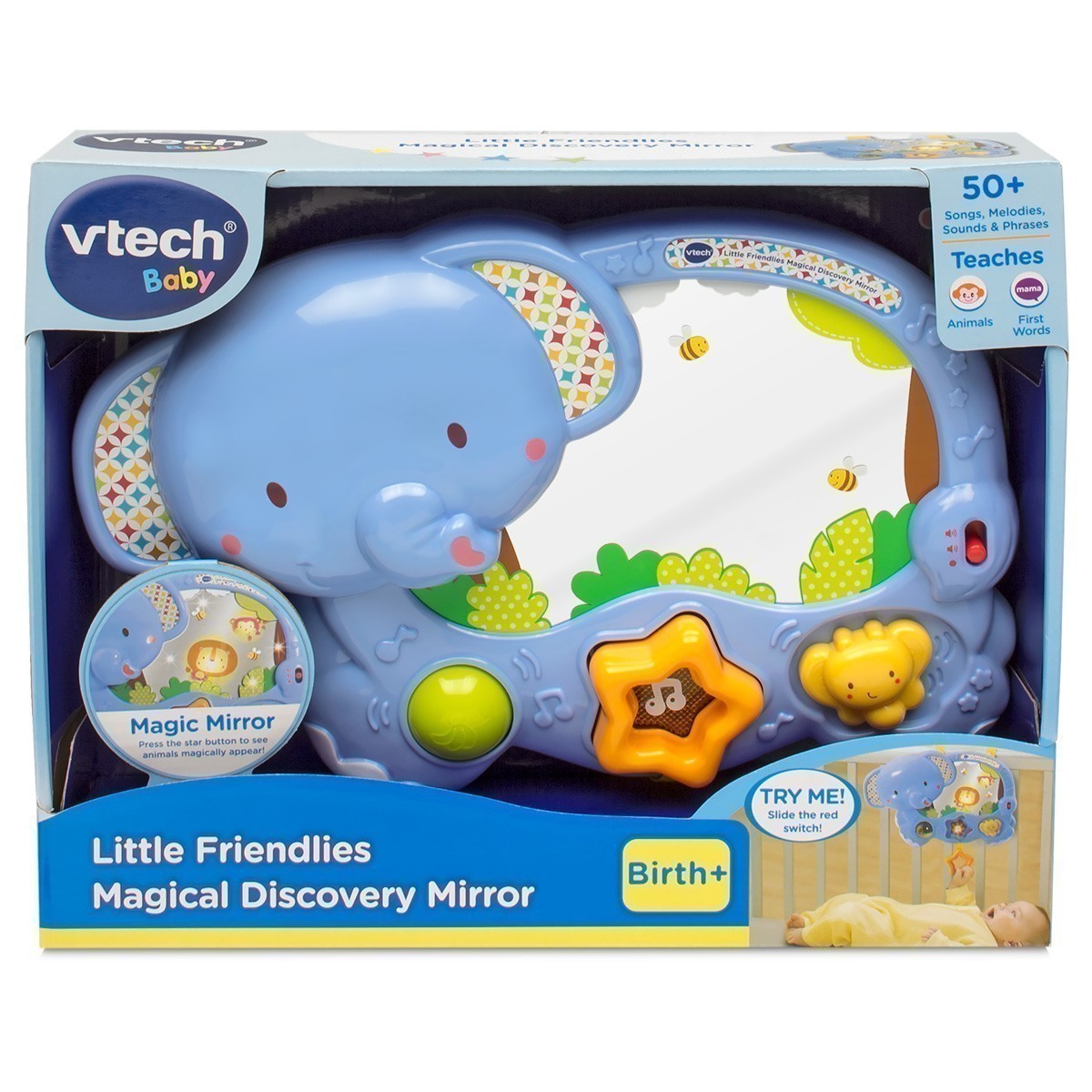 Introducing the Little Friendlies Magical Discovery Mirror by VTech! This cute little elephant mirror will provide plenty of discovery fun for your little one. Press the light up star button to discover the hidden monkey and lion! Pressing the light up star button will also play fun phrases, sounds, sing-along songs and melodies. The Little Friendlies Magical Discovery Mirror can attach to a cot and can also be played with on the floor thanks to its inclined back. The mirror features a rolling ball and spinning butterfly for baby to play with. Enjoy the 3 sing-along songs and 10 melodies.