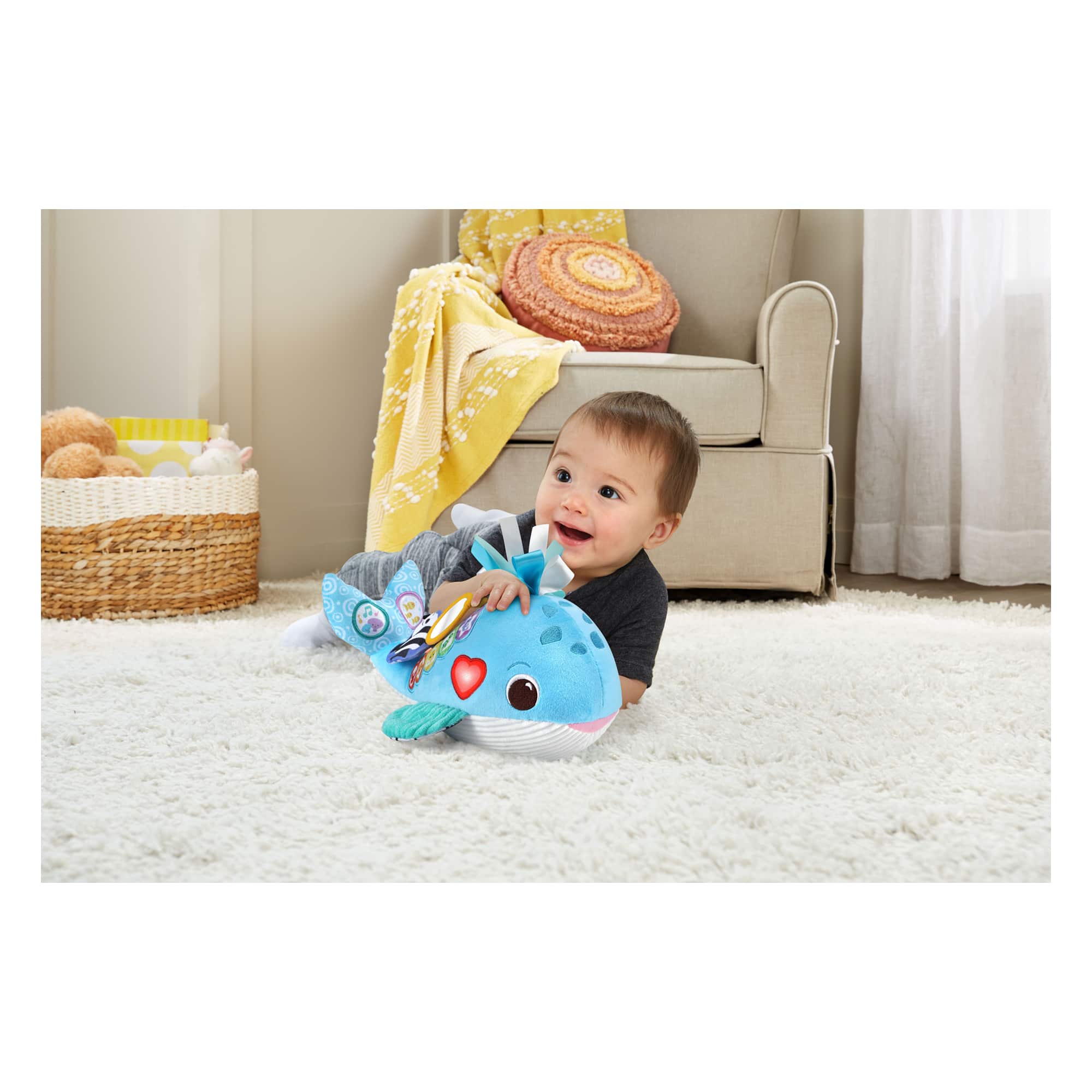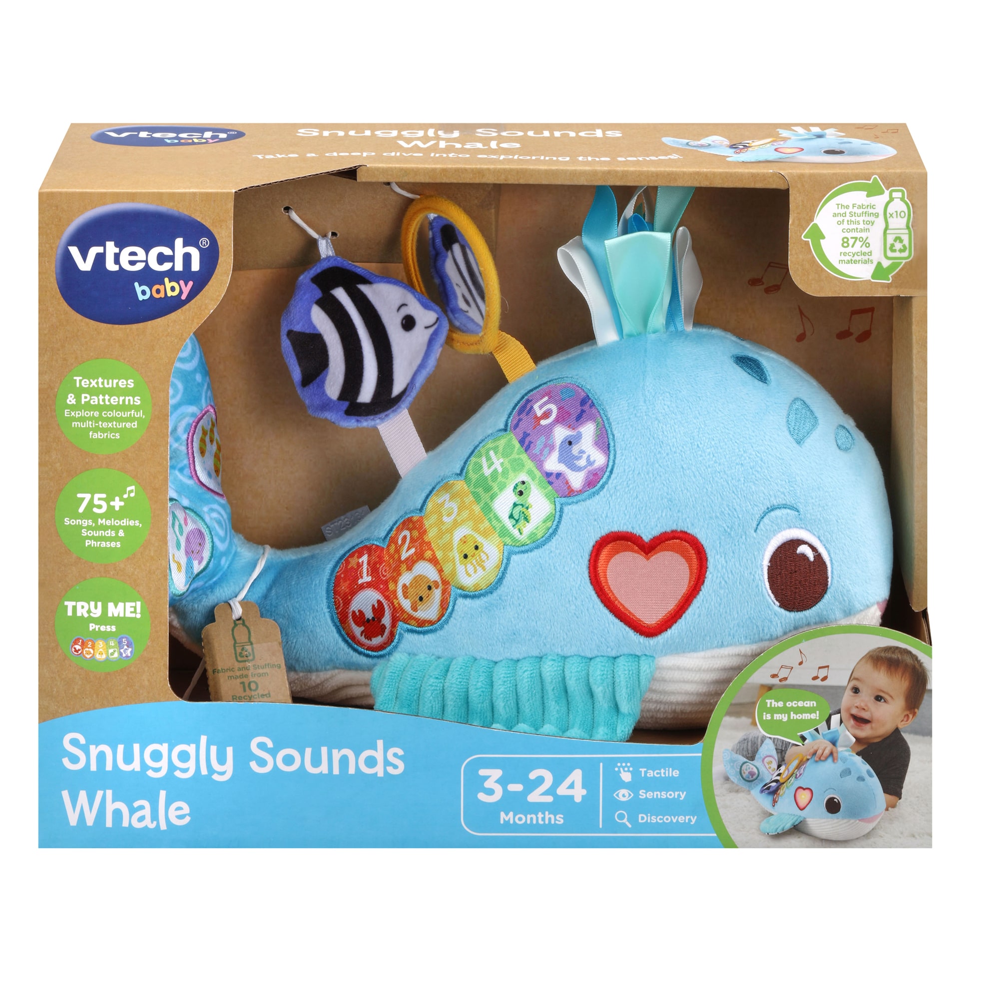 Take a sensory-filled dive into learning with the Vtech Baby Snuggly Sounds Whale! This soft fabric whale, made from recycled plastic bottles, features five colorful piano keys that introduce numbers, ocean animals, and playful sound effects.