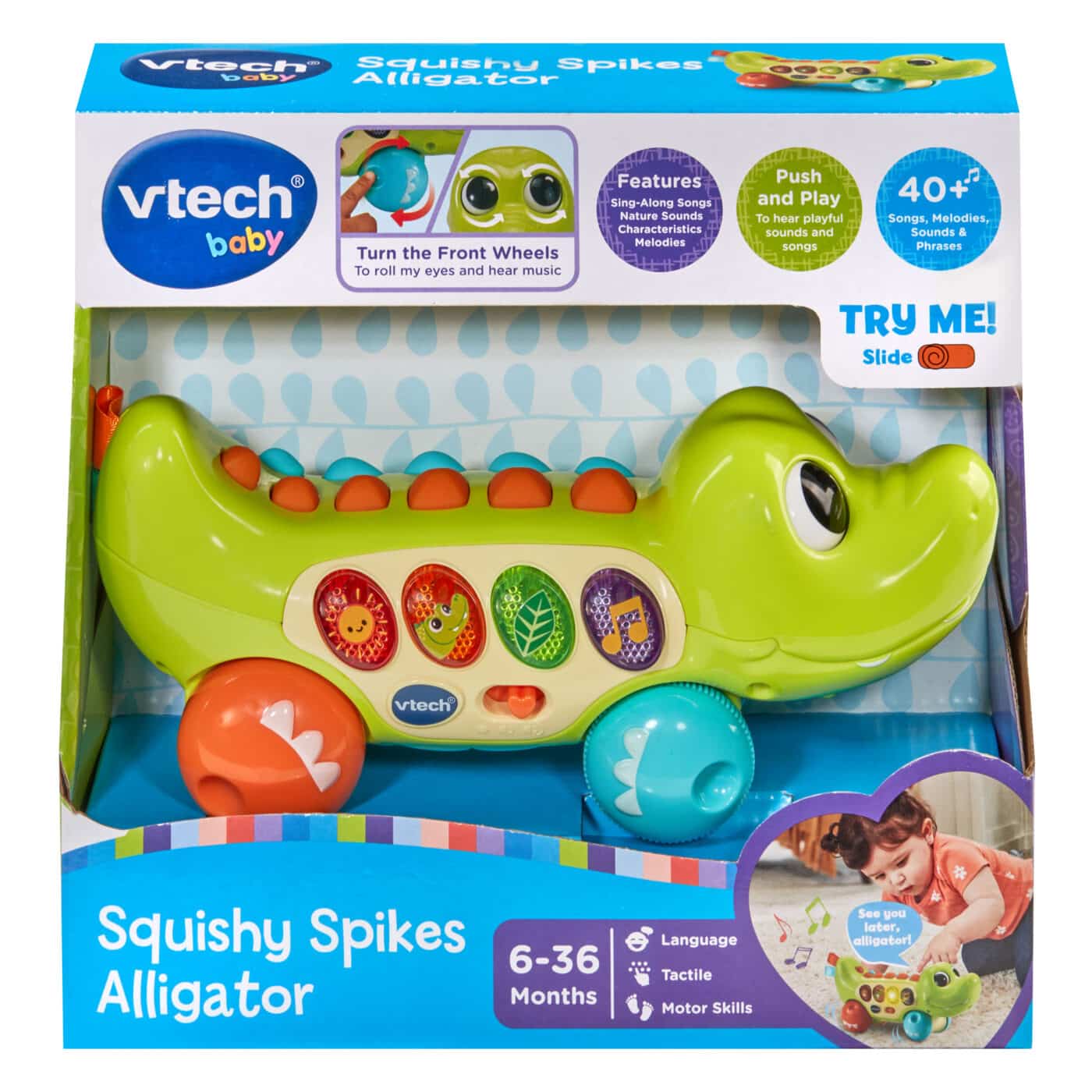 Get ready for sensory fun and learning with the Vtech Baby Squishy Spikes Alligator! This adorable push-along alligator encourages toddlers to get moving while teaching them about colors, nature sounds, and alligator facts. As your child pushes the alligator forward or backward, its eyes spin, captivating their attention and sparking curiosity.