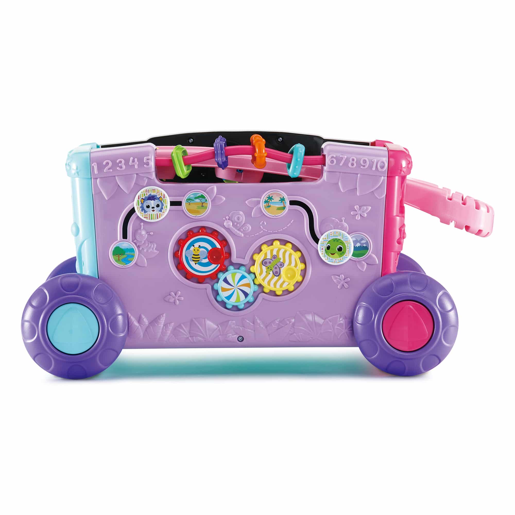 - Interactive Play: Features a light-up activity panel with animals, numbers, colors, and shapes.