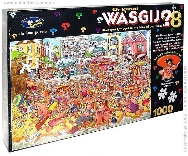 In this Wasgij? jigsaw puzzle from Holdson you will notice that something is happening out at sea that is disturbing our holiday makers. Something has scared the bathers on this hot summer’s day! But what could it be? The picture you see on the box is simply a CLUE to what the picture is. Look into this scene entitled “High Tide” and imagine you’re the holiday maker (man in the center of picture) – what can he see BEYOND and INCLUDING the heads and deckchairs of the sleeping granny and grandad? This is the view you have to complete.